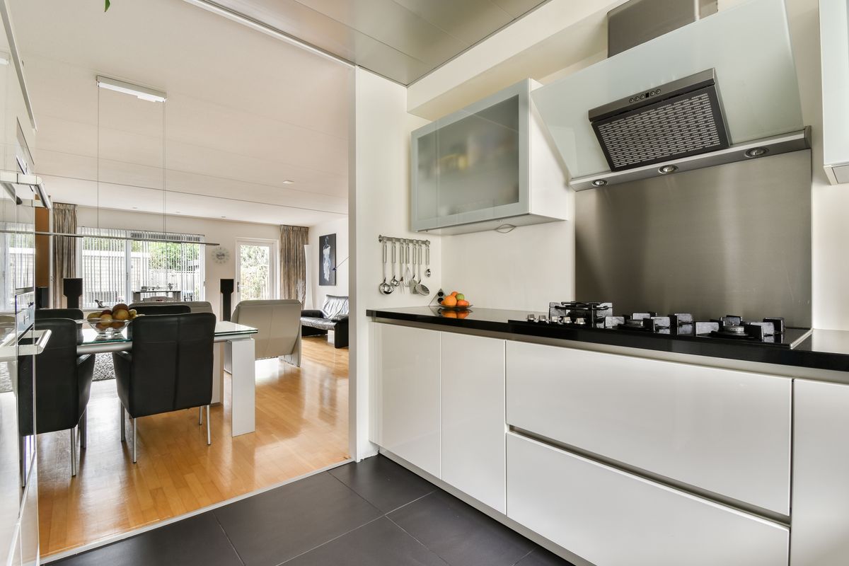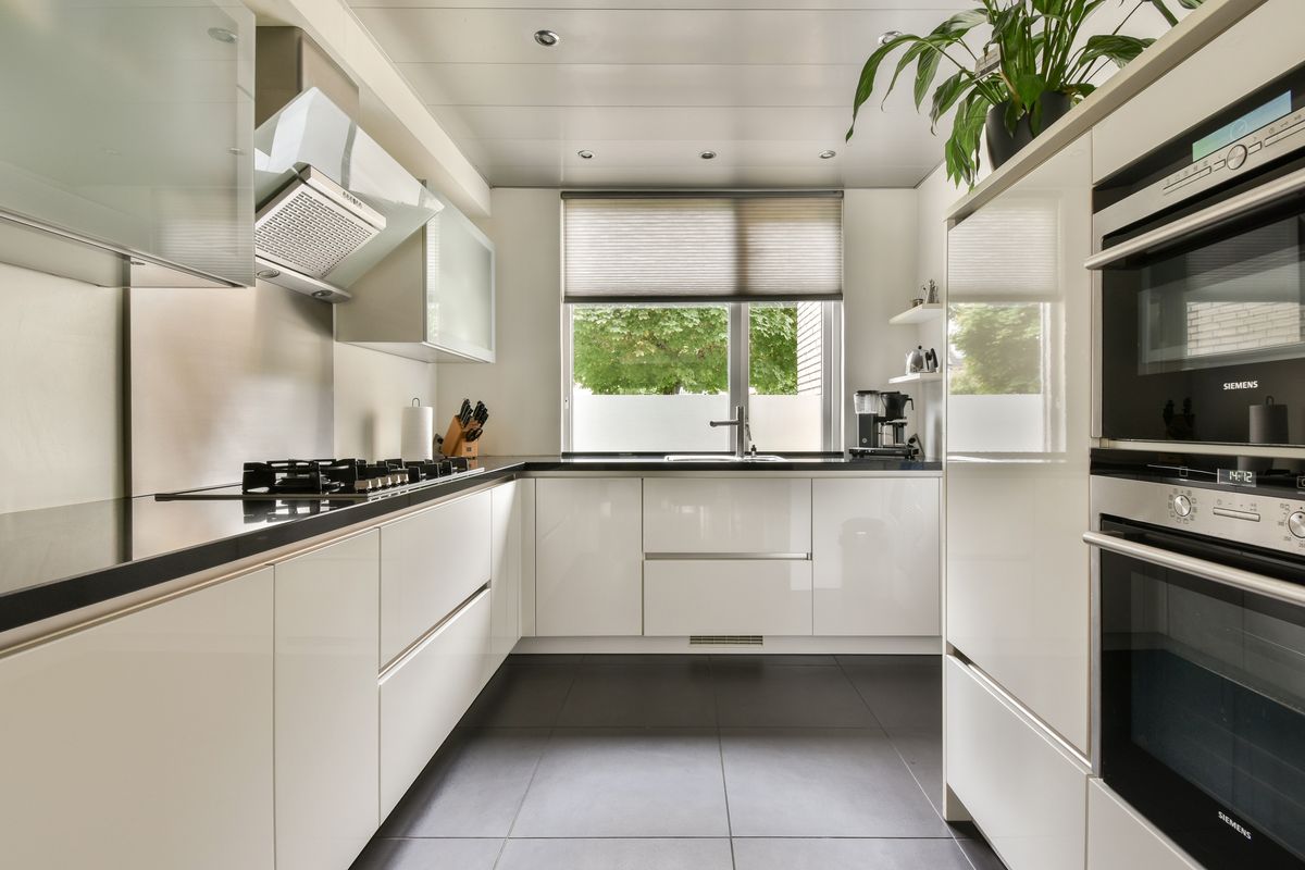 Aan de voorzijde bevindt zich de moderne open keuken, een echte blikvanger in de woning. De keuken is opgesteld in een praktische, eigentijdse indeling en voorzien van diverse inbouwapparatuur zoals een gaskookplaat, afzuigkap, oven, combi magnetron, vaatwasser en koelkast. Dankzij de ruime werkbladen heb je alle ruimte om uitgebreid te koken.