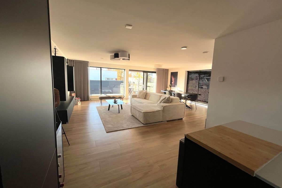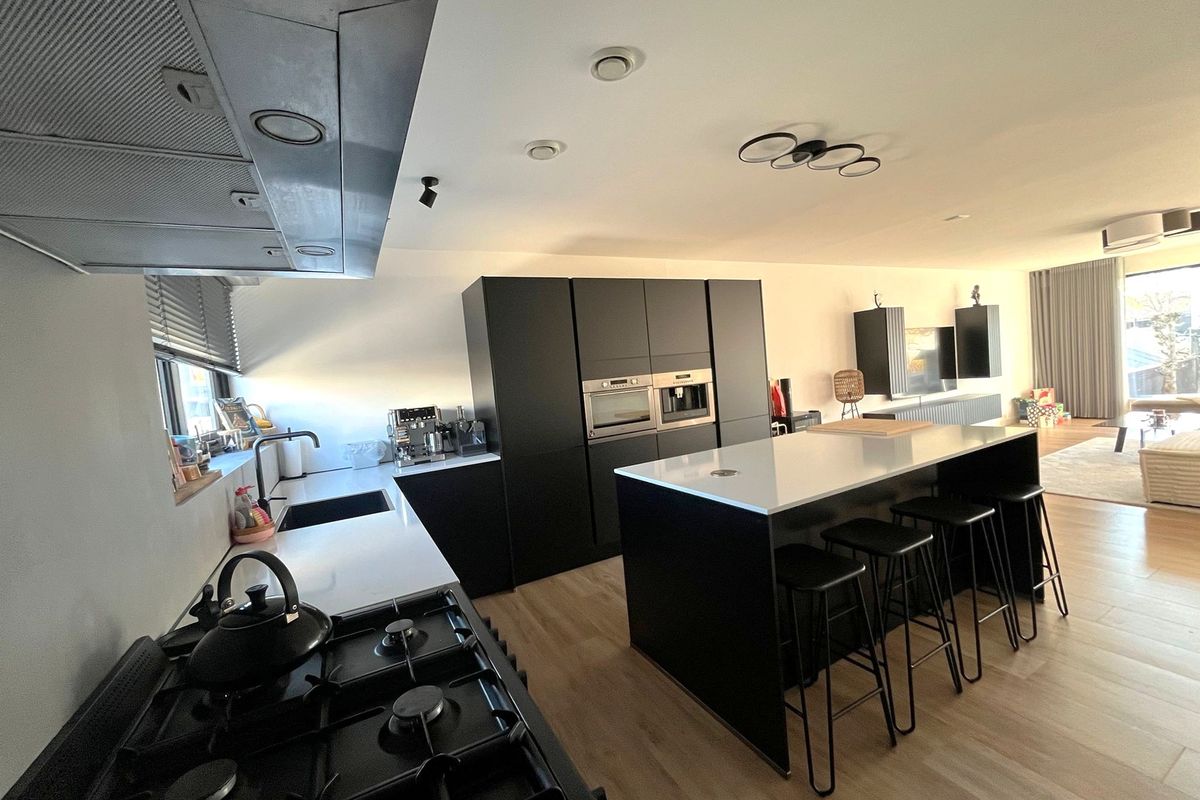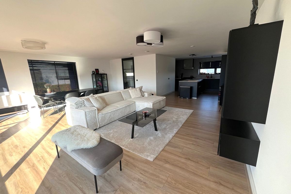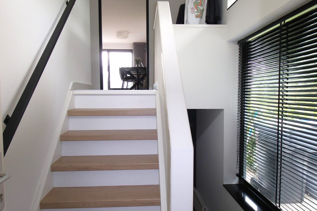 entree, centrale hal, deur naar garage, meterkast, trapopgang, 2e hal met 2e modern toilet met fonteintje, garderobe, royale L-vormige woonkamer met schuifpui, open nieuwe keuken (2012) met keukeneiland en inbouwapparatuur o.a. koffiezetapparaat en 2 ovens, cv-/bergkast, balkon, trapneergang naar beschutte moderne nieuw (2023) aangelegde binnentuin voorzien van automatische verlichting en elektrisch bedienbare zonwering, vrij achterom, geïsoleerde garage met elektrische bedienbare geïsoleerde deur, uitstortgootsteen, waterontharder en kleine patio.