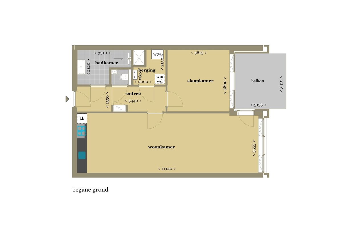 klein trapje naar entree, gang. Badkamer met wastafel en inloopdouche. Separaat toilet. Inpandige berging met aansluiting wasmachine/droger. Slaapkamer met toegang tot het ruime en zonnig balkon op het zuiden. Royale woonkamer met open, complete keuken (v.v. inductiekookplaat, vaatwasser, combi-oven/magnetron, koelkast met vriesvak en afzuigkap) met tevens deur naar het ruime balkon.