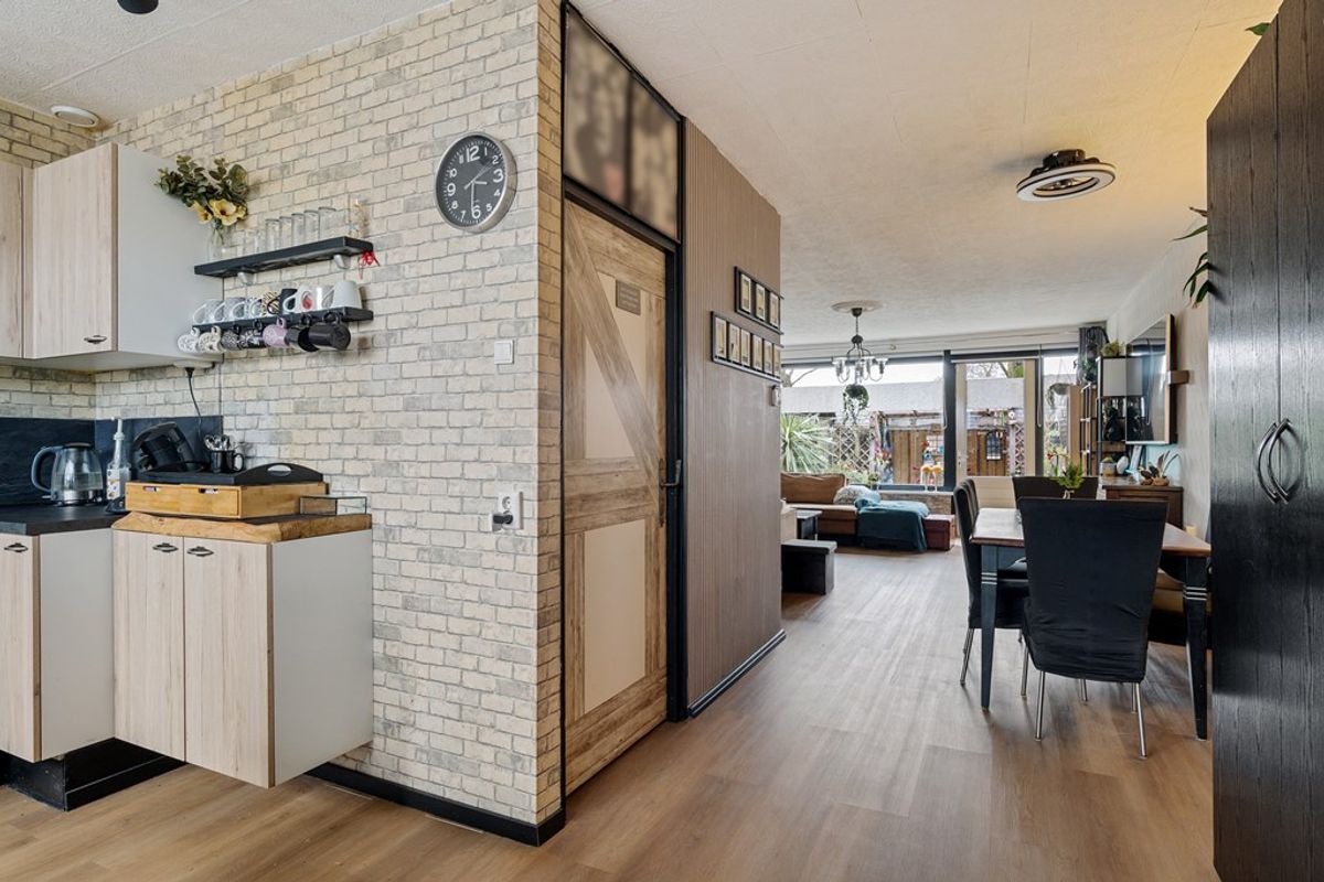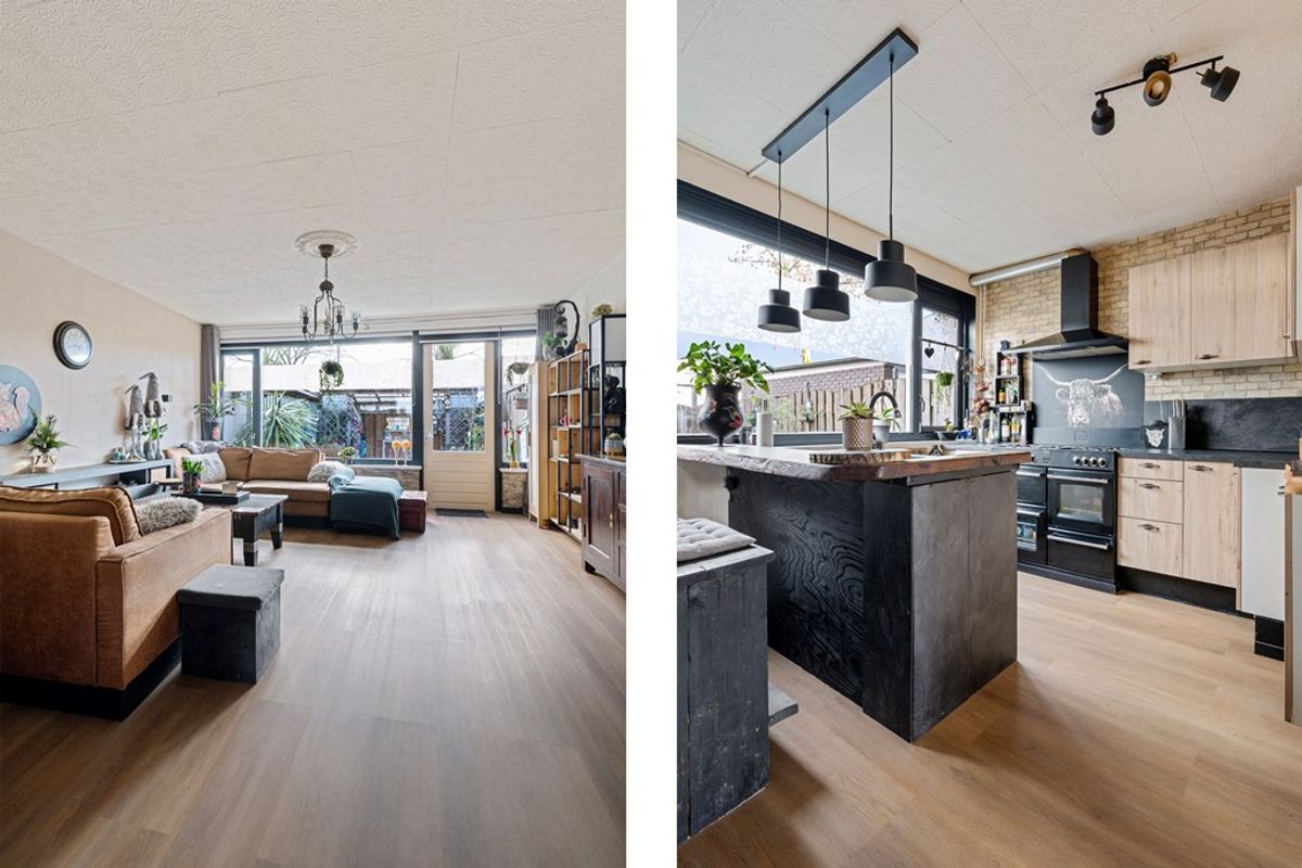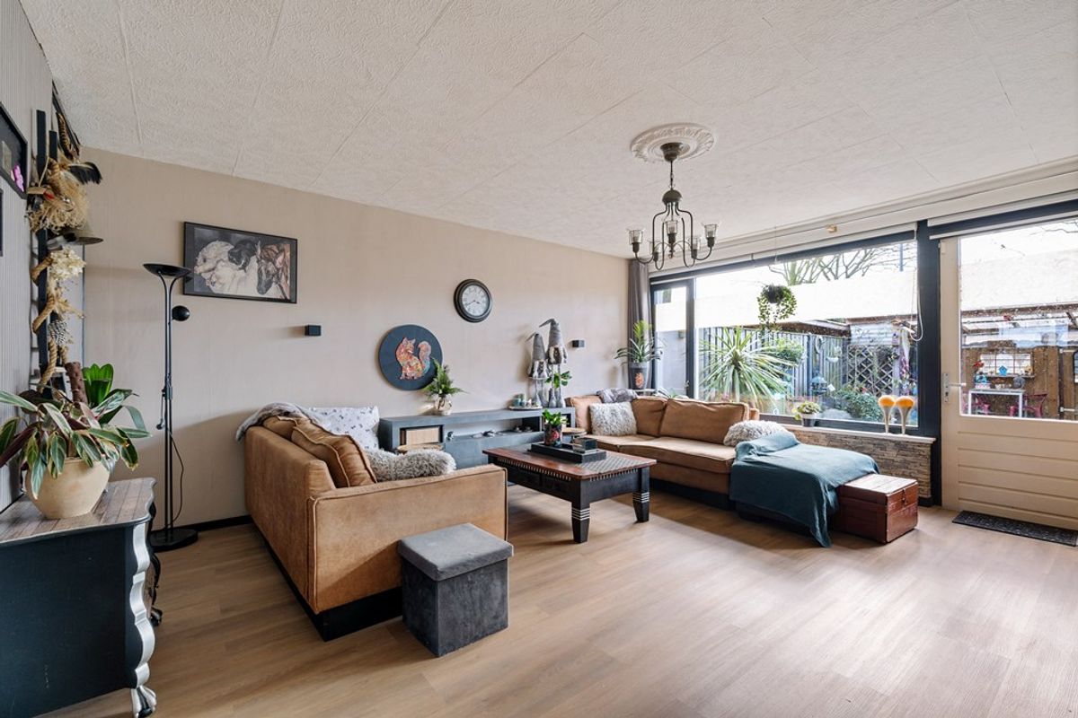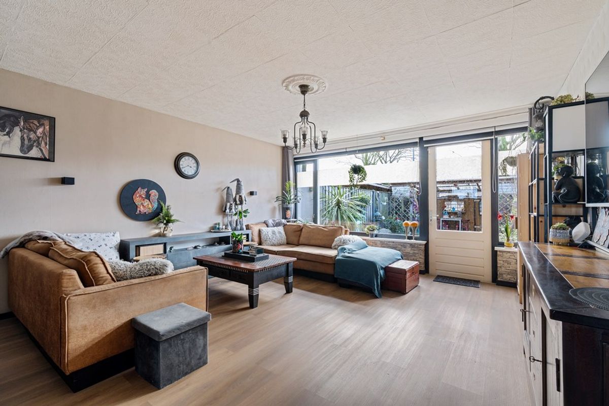 Loop je door, dan bereik je de woonkamer. Deze ruimte is ruim opgezet en voorzien van een laminaatvloer, met volop plek voor een zithoek en een eethoek. Dankzij de raampartijen aan de voorzijde en achterzijde valt er veel daglicht naar binnen en kijk je prettig uit op de tuin. Aan de achterzijde bevindt zich een deur naar de achtertuin, waardoor binnen en buiten mooi in elkaar overlopen.