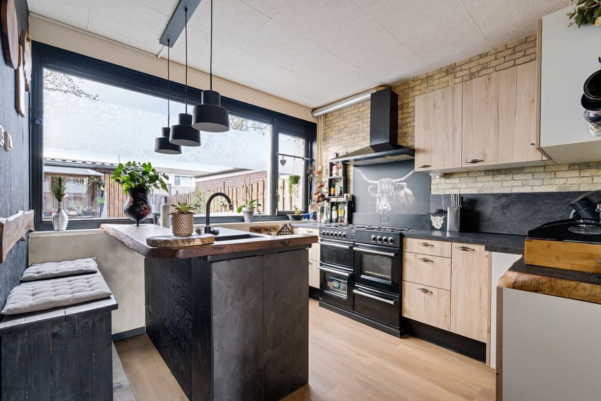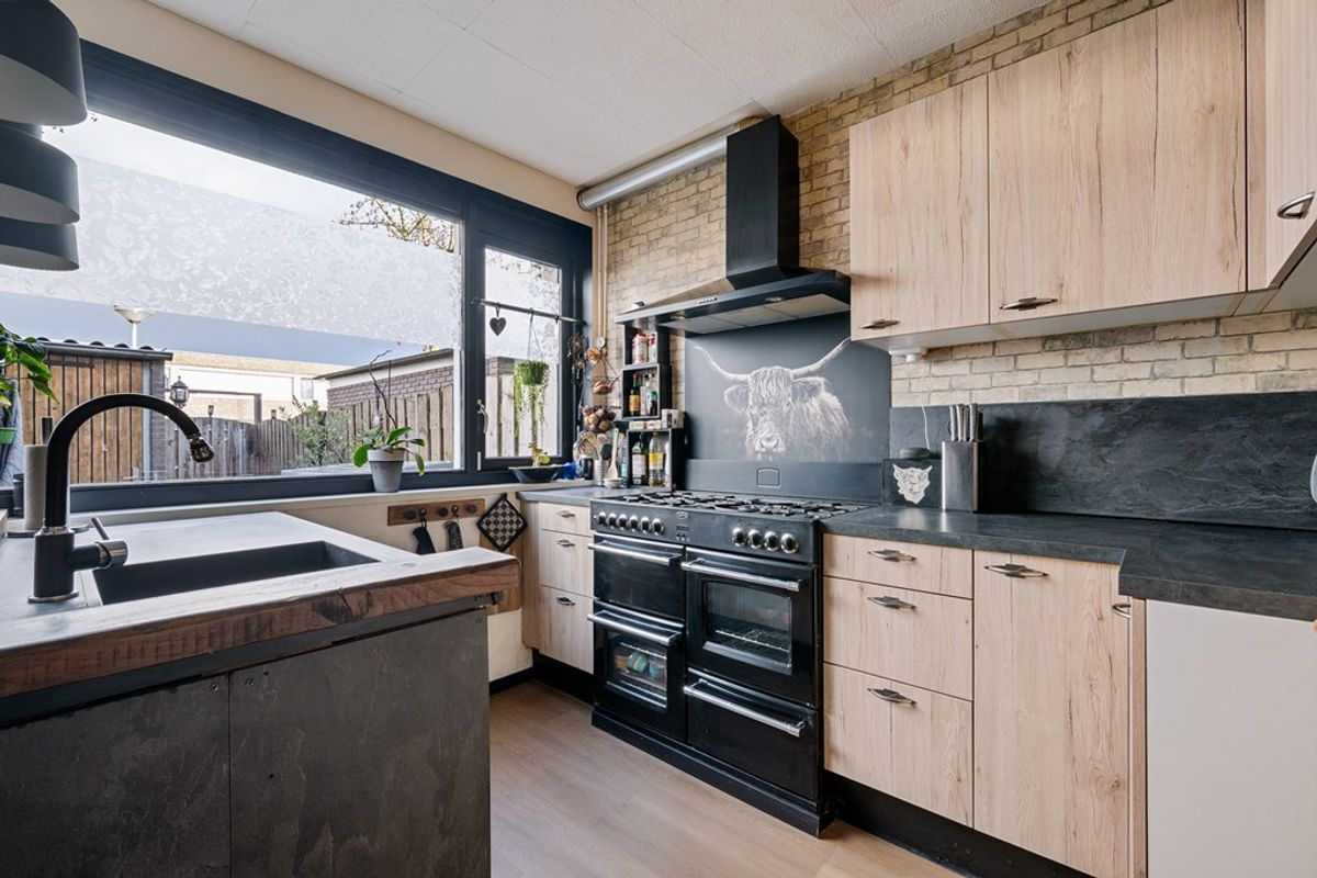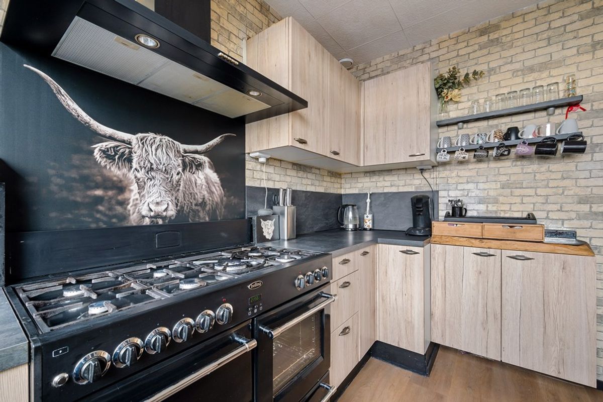 Aan de voorzijde van de woonkamer vind je de open keuken. De keuken kenmerkt zich door de houtlook keukenkastjes en het donkere werkblad, en biedt veel werkruimte. Je beschikt hier over een gasfornuis met oven, een afzuigkap en een spoelbak met kraan.