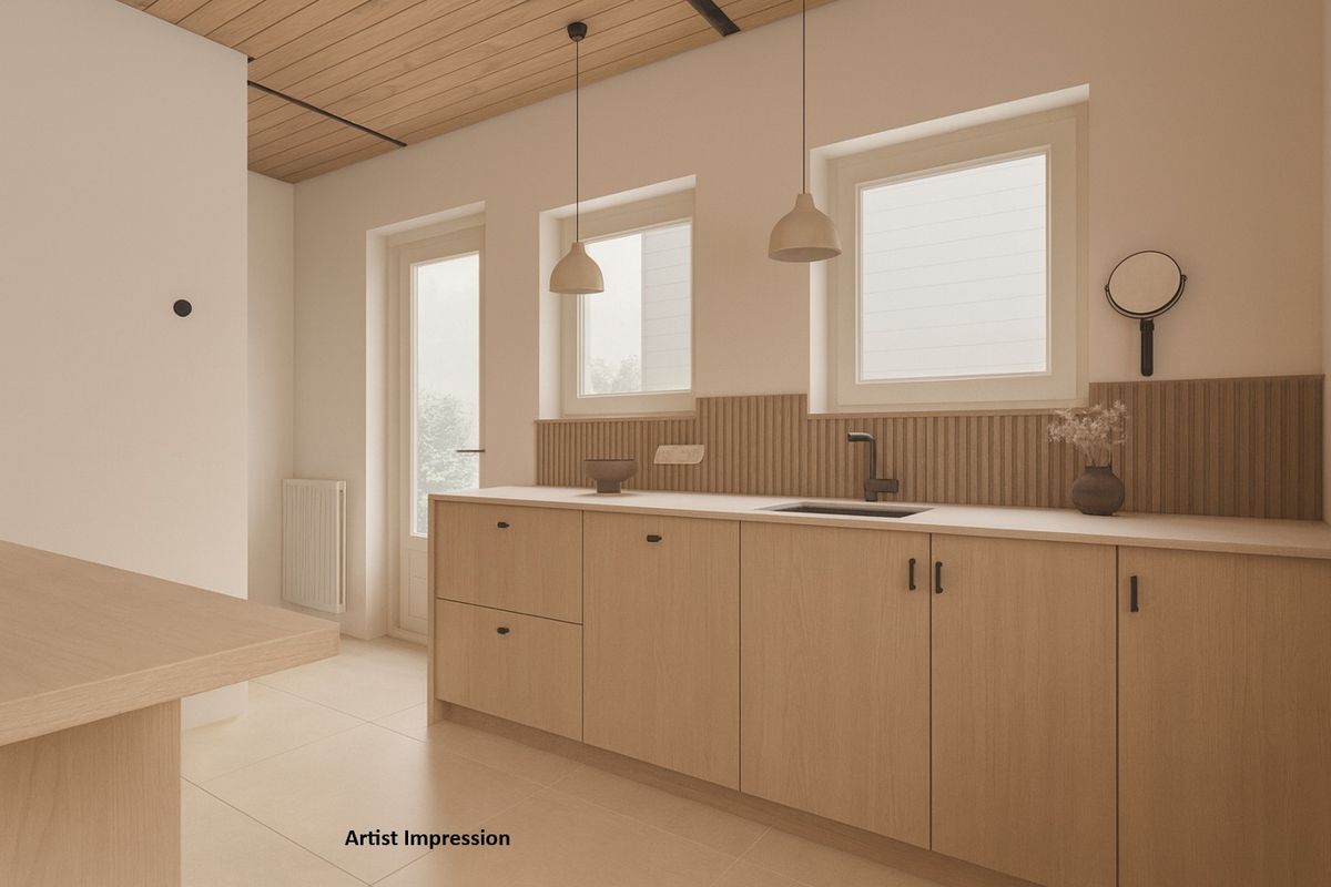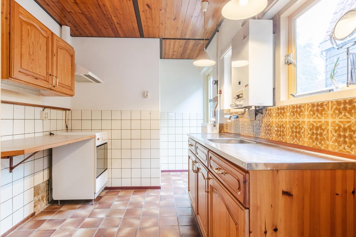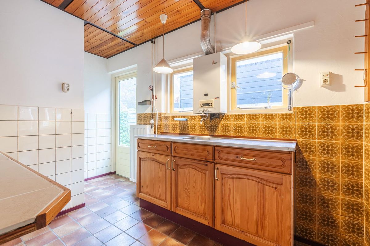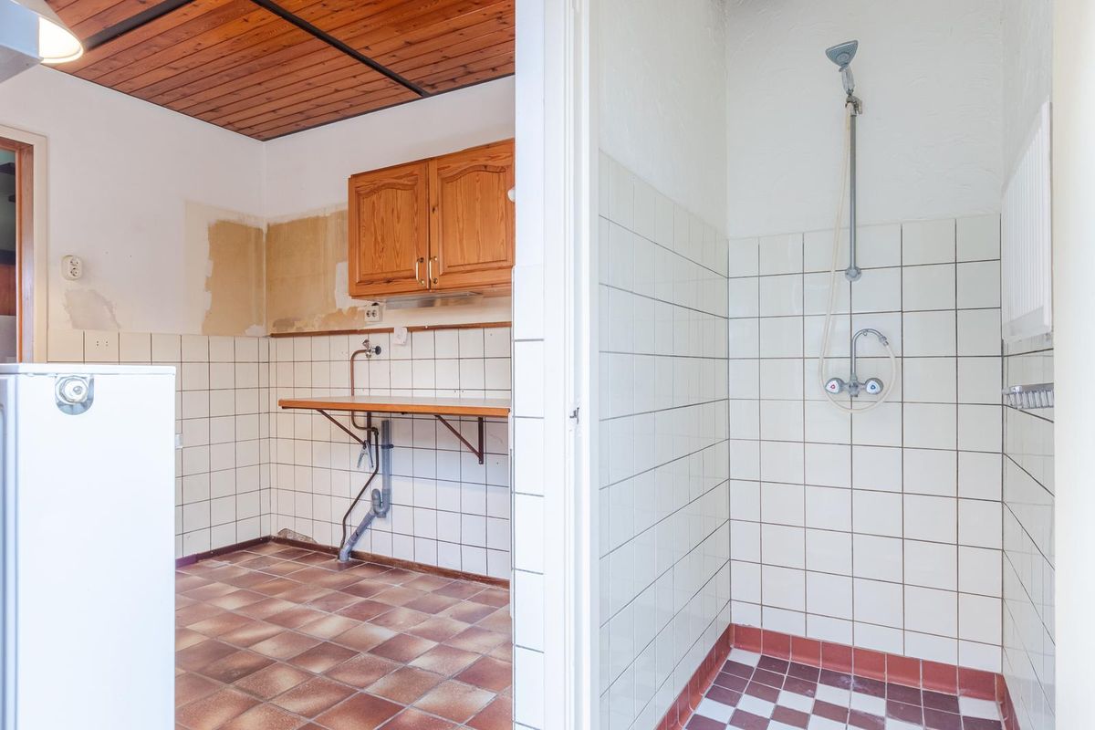 De keuken bevindt zich aan de achterzijde en is eenvoudig, maar netjes uitgevoerd. Hier vind je tevens de douchegelegenheid – praktisch en functioneel ingericht. Vanuit de keuken heb je toegang tot de tuin.