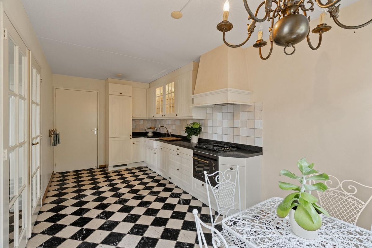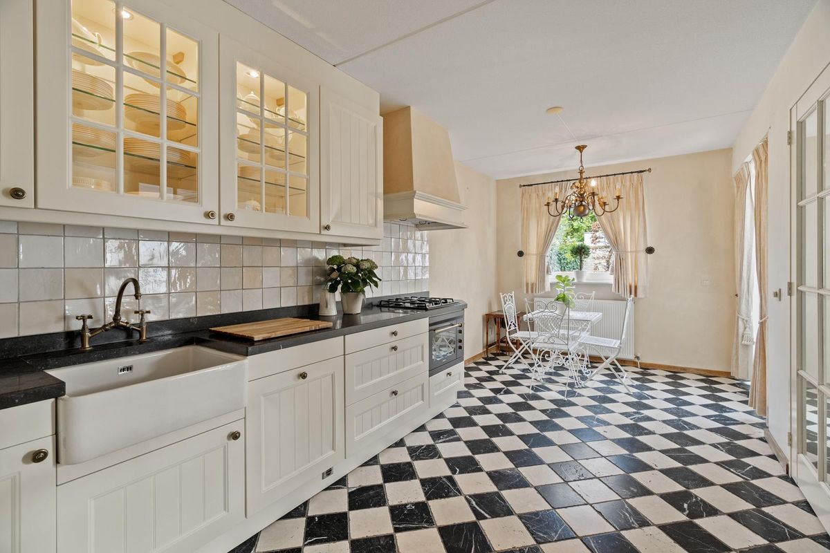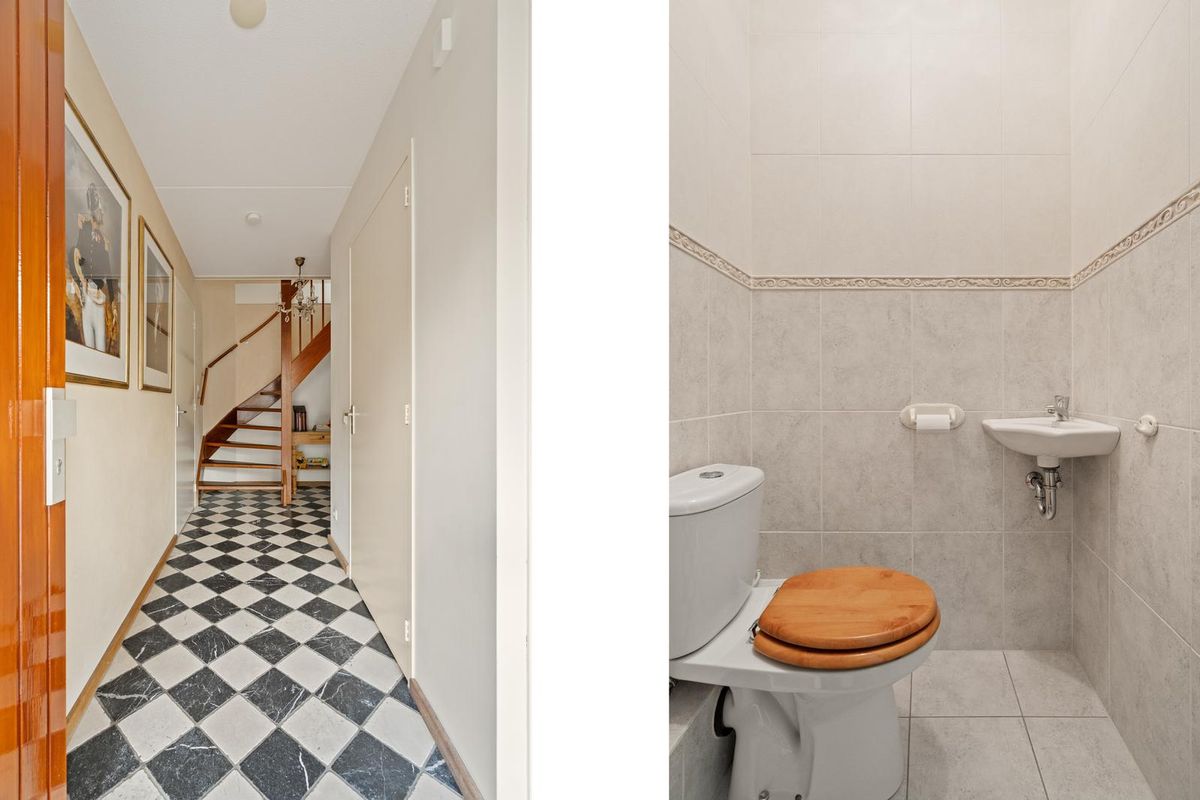 Entree aan de voorzijde in ruime en lichte hal met toiletruimte, trapopgang en binnendoor toegang tot de garage. De royale woonkamer is voorzien van een sfeervolle houten vloer en biedt volop ruimte voor een zit- en eethoek. Aan de achterzijde bevindt zich de landelijke keuken in lichte kleurstelling, uitgerust met diverse inbouwapparatuur. Grote raampartijen zorgen voor veel lichtinval en prettig contact met de tuin.