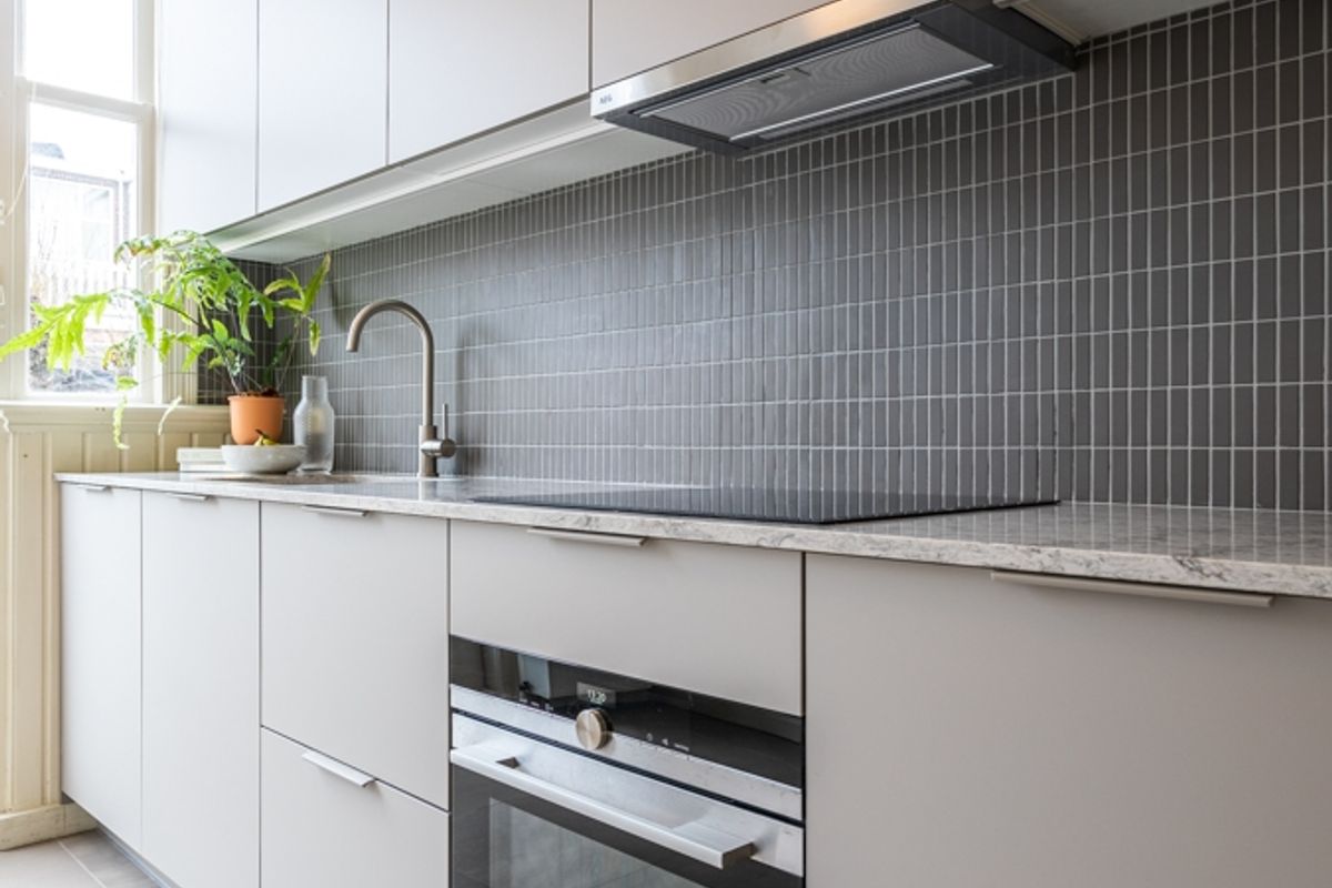 The two spaces can also be closed off with connecting doors for flexibility. From the dining room at the rear, you can enter the adjacent kitchen. The modern kitchen is fully equipped with an induction hob, extractor hood, oven, dishwasher, fridge-freezer, and ample cupboard space, and it has direct access to its own balcony.