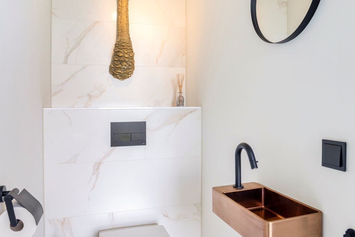 Aan de voorzijde bevindt zich de keuken – een echte blikvanger: tijdloos, strak en van hoge kwaliteit. Het royale kookeiland met barzitje vormt het hart van de ruimte, ideaal voor een gezellig ontbijt of een borrel met vrienden. De keuken is voorzien van een inductiekookplaat met geïntegreerde afzuiging, vaatwasser, oven, ingebouwd koffiezetapparaat, koelkast, vriezer en een luxe marmeren werkblad. Dankzij de open verbinding met de eetruimte ontstaat een sfeervol geheel waar koken, eten en wonen perfect samenkomen.