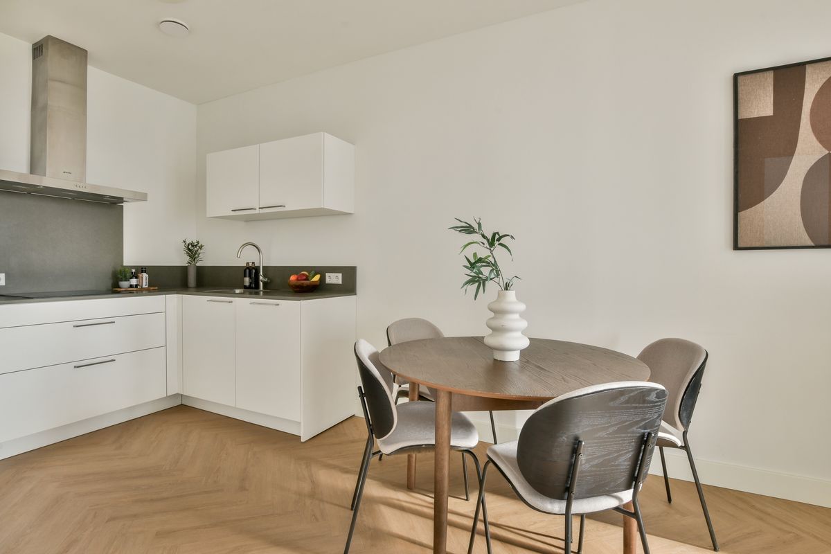 De open keuken is uitgevoerd in een praktische L-opstelling en voorzien van diverse inbouwapparatuur, waaronder een magnetron-ovencombinatie, een afwasmachine, een inductiekookplaat, ijskast en afzuigkap. Daarnaast is er voldoende kastruimte aanwezig en is er plaats voor een eettafel.