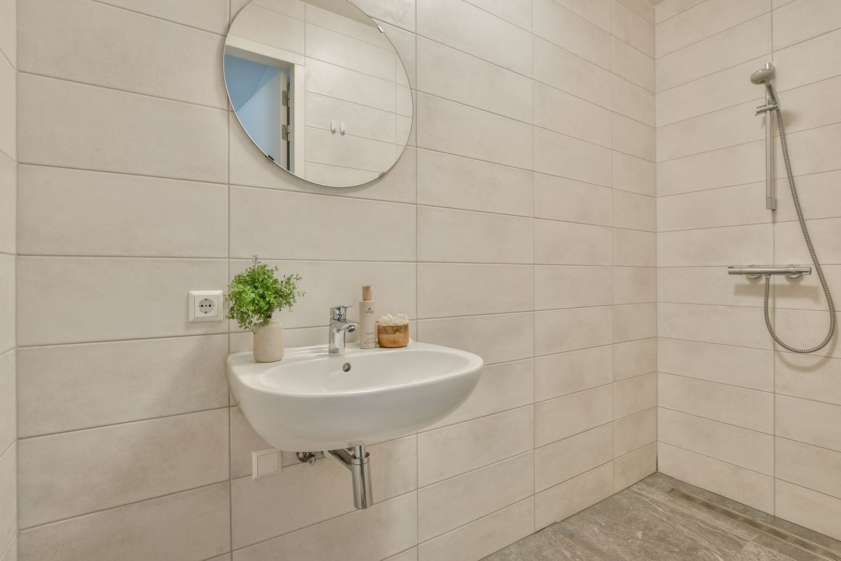 De badkamer is netjes afgewerkt en uitgerust met een douche en een wastafel. Verder is er een separaat toilet aanwezig.