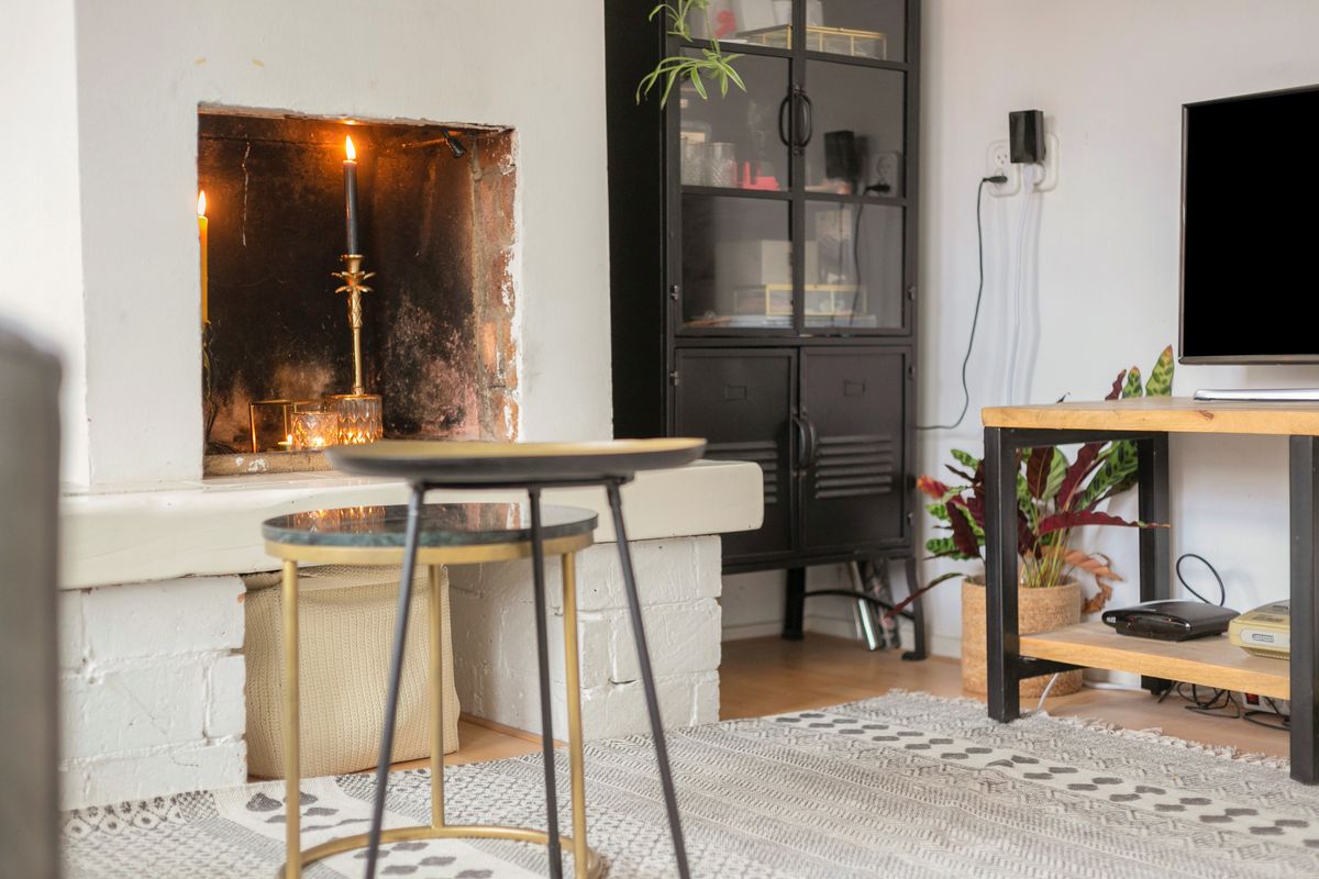 Eerste etage: Een sfeervolle woonkamer met open haard en grote raampartijen die zorgen voor veel lichtinval en een warm gevoel.