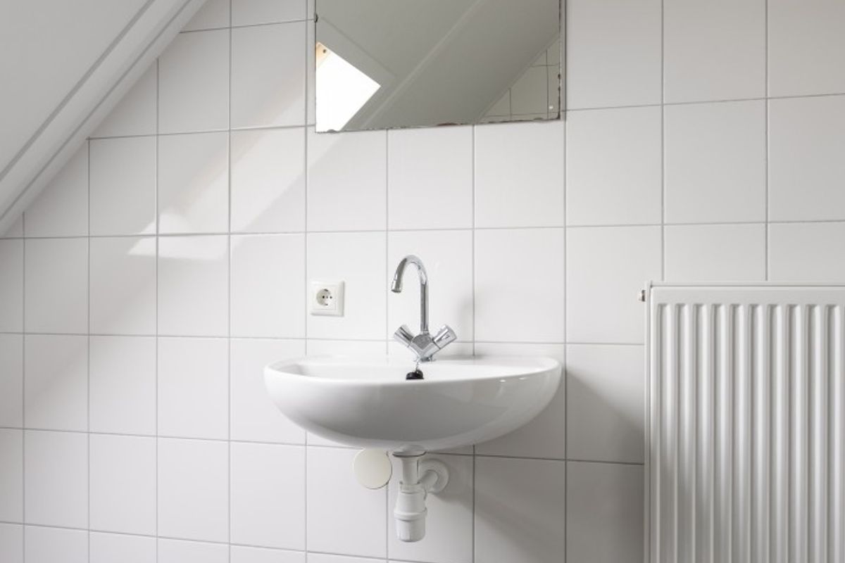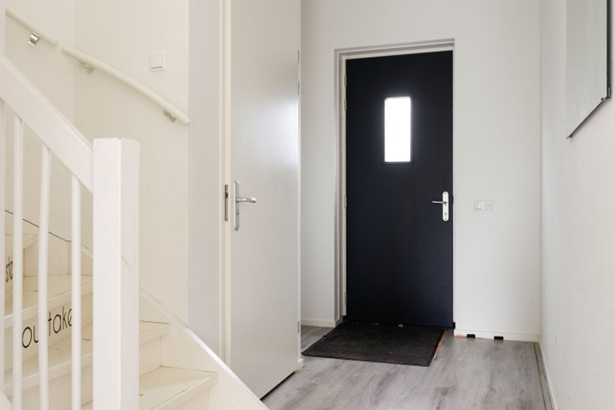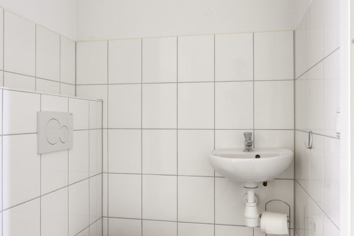 Je komt binnen in een lichte hal met de trapopgang, meterkast en een modern toilet met fonteintje.