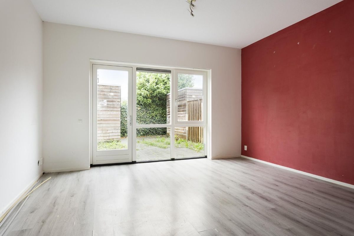 Vanuit hier loop je door naar de woonkamer, die dankzij de grote raampartijen en de openslaande deur naar de tuin een frisse en open sfeer heeft.