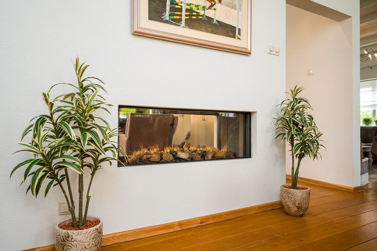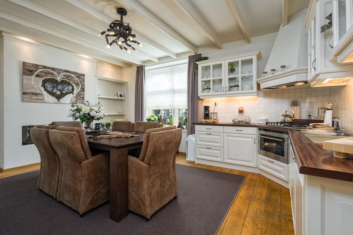 Het voorhuis beschikt over een bijzonder royale woonkeuken, welke fungeert als het kloppend hart van het huis. Met uitzicht op de Voorstraat en de oprit is dit een plek waar dagelijks leven en samenzijn moeiteloos samenkomen. Aangrenzend bevindt zich een zeer ruime provisieruimte, ideaal voor opslag en functionaliteit. De sfeervolle woonkamer, voorzien van een open haard (fireplace), kenmerkt zich door haar warme uitstraling en de grote raampartijen die zorgen voor een fraai lichtinval en een weids uitzicht.