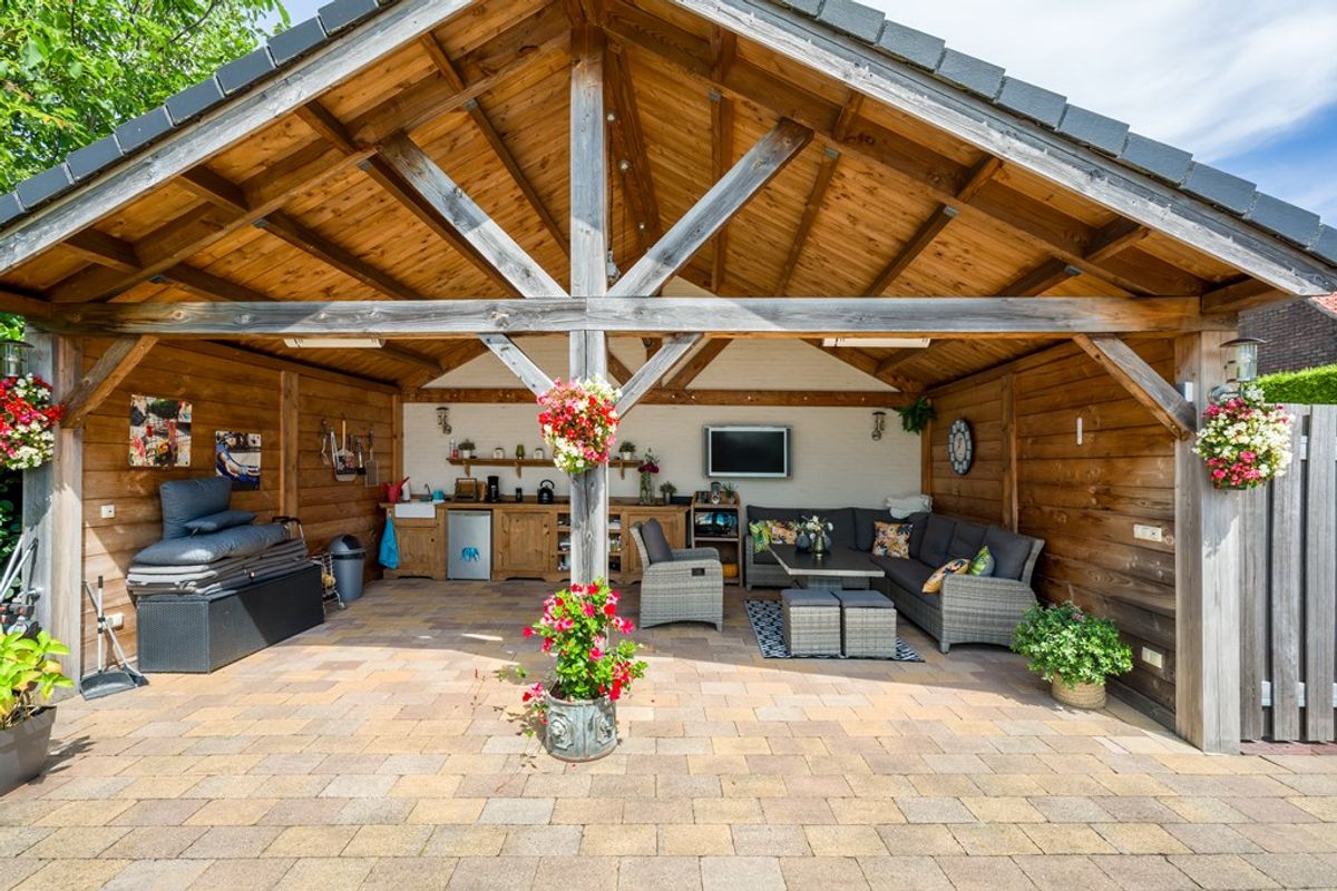 Direct achter het kantoorgebouw bevindt zich een sfeervolle overkapping met vide, voorzien van een buitenkeuken en tv-aansluiting. Een ideale setting voor lange zomeravonden en het ontvangen van grotere gezelschappen.