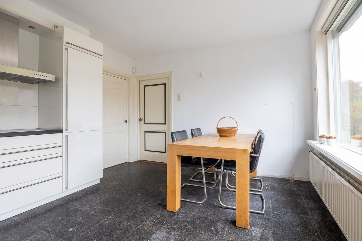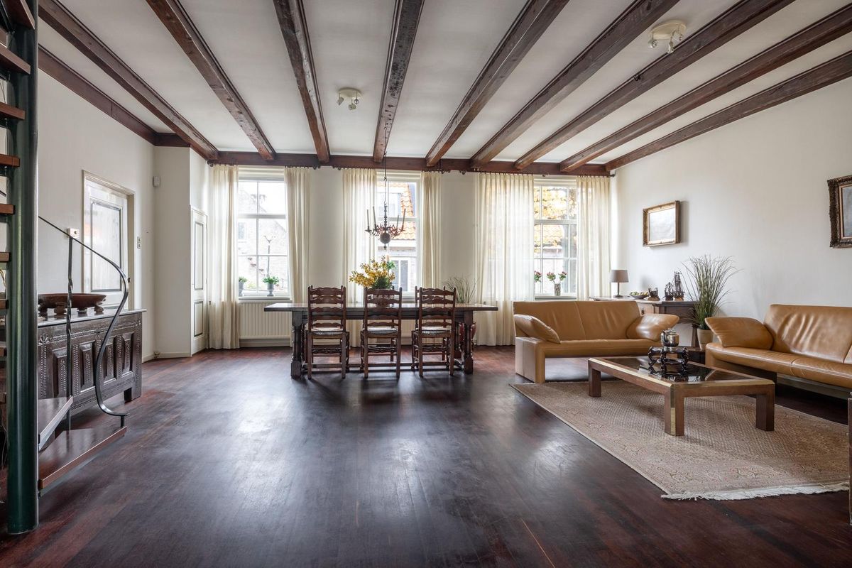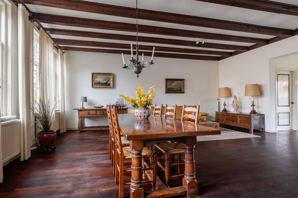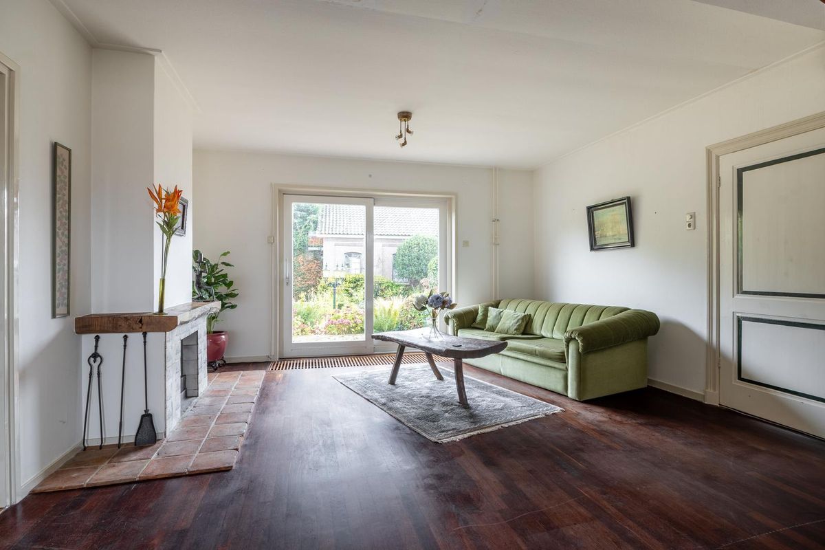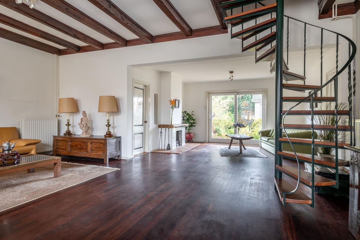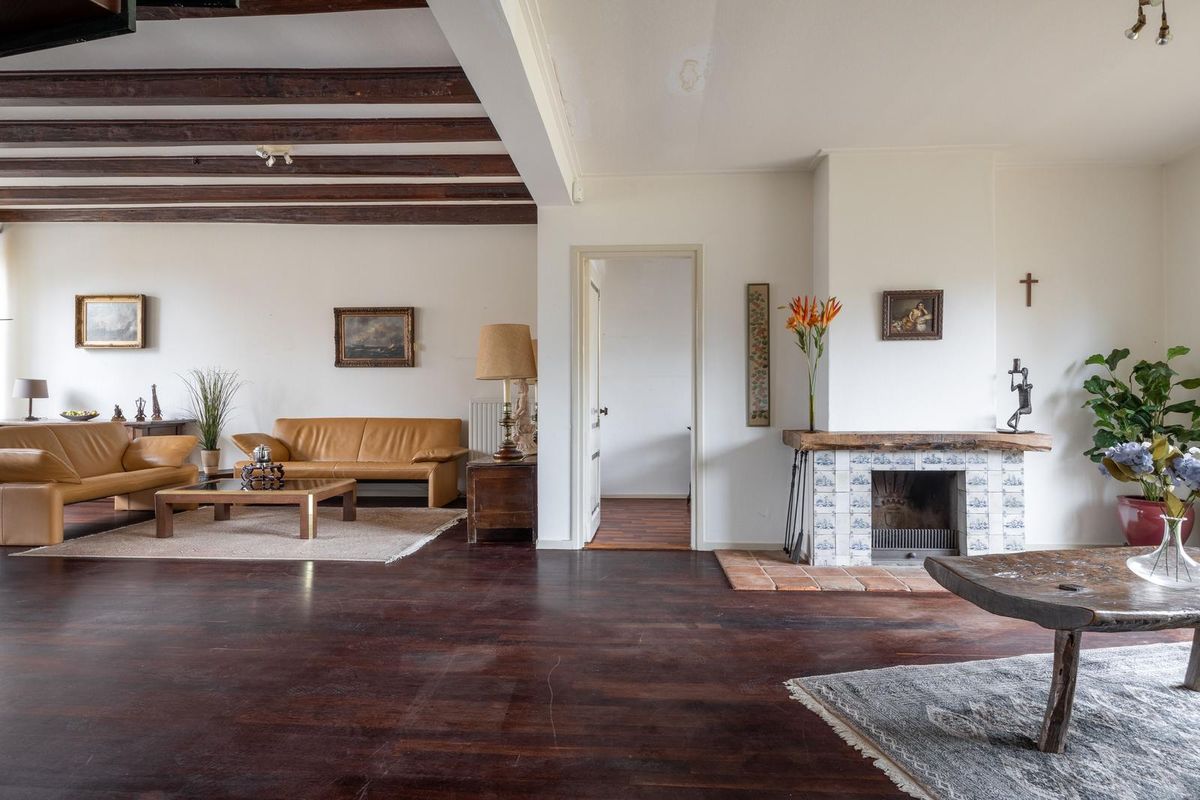De woonkamer is voorzien een openhaard met schouw, de wenteltrap naar de verdieping en geeft toegang tot de studeerkamer en de keuken. Door de aanbouw (geplaatst circa 2020) is deze ruimte een zeer ruim en zonnig vertrek. De woonkamer is afgewerkt met een houten vloer, stukwanden en grotendeels een houten balkonplafond.