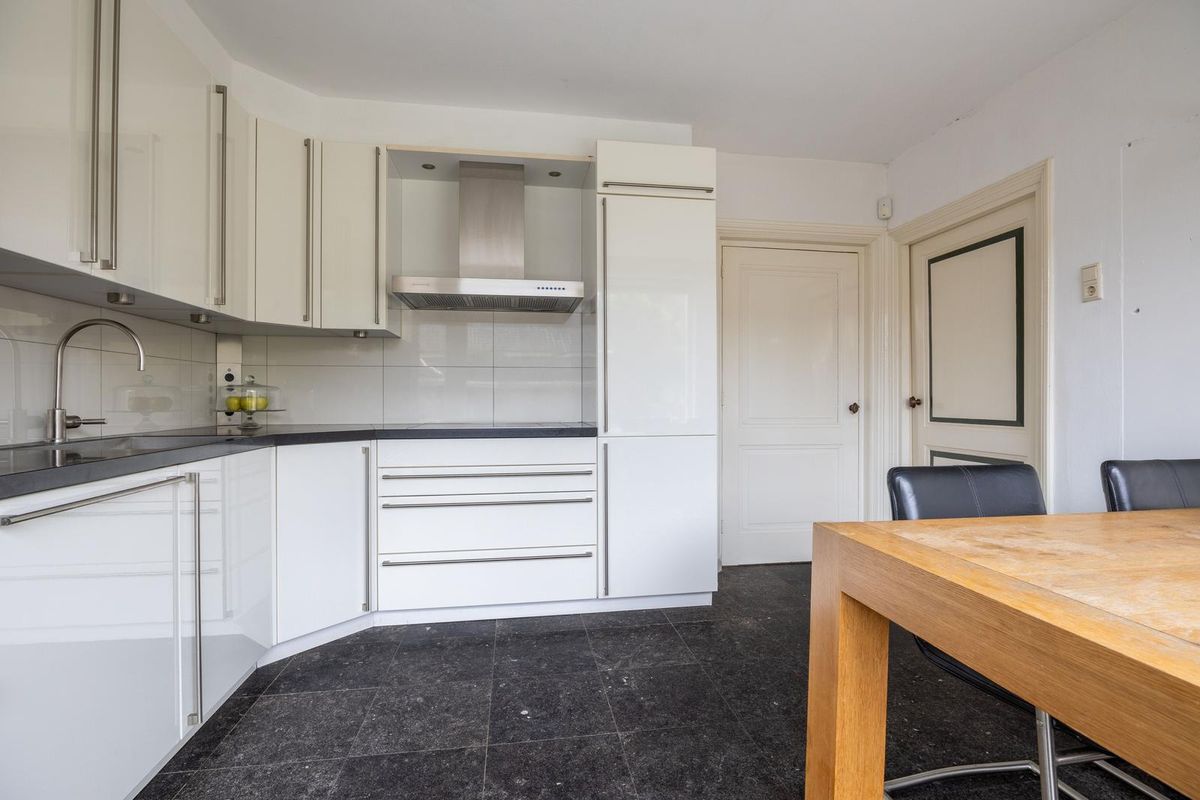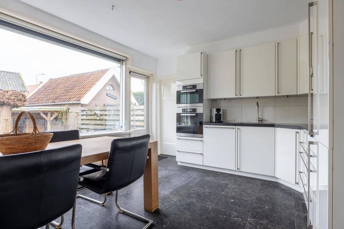 De keuken is uitgerust met moderne inbouwapparatuur, waaronder een oven, magnetron, vaatwasser, inductiekookplaat, koel/vries-combinatie en een afzuigsysteem. De kastfronten zijn in hoogglans wit afgewerkt en het aanrechtblad is antraciet. De zwarte tegelvloer zorgt voor een strakke uitstraling. Vanuit de keuken is er toegang tot de bijkeuken met aansluitingen voor een wasmachine en droger en een loopdeur naar de tuin.