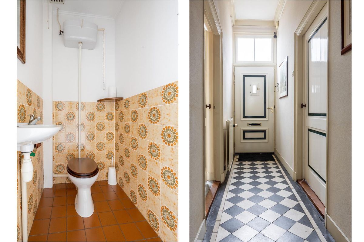 De toiletruimte is nostalgisch te noemen met haar staand toilet met hangreservoir, fonteintje en de deels betegelde wanden.