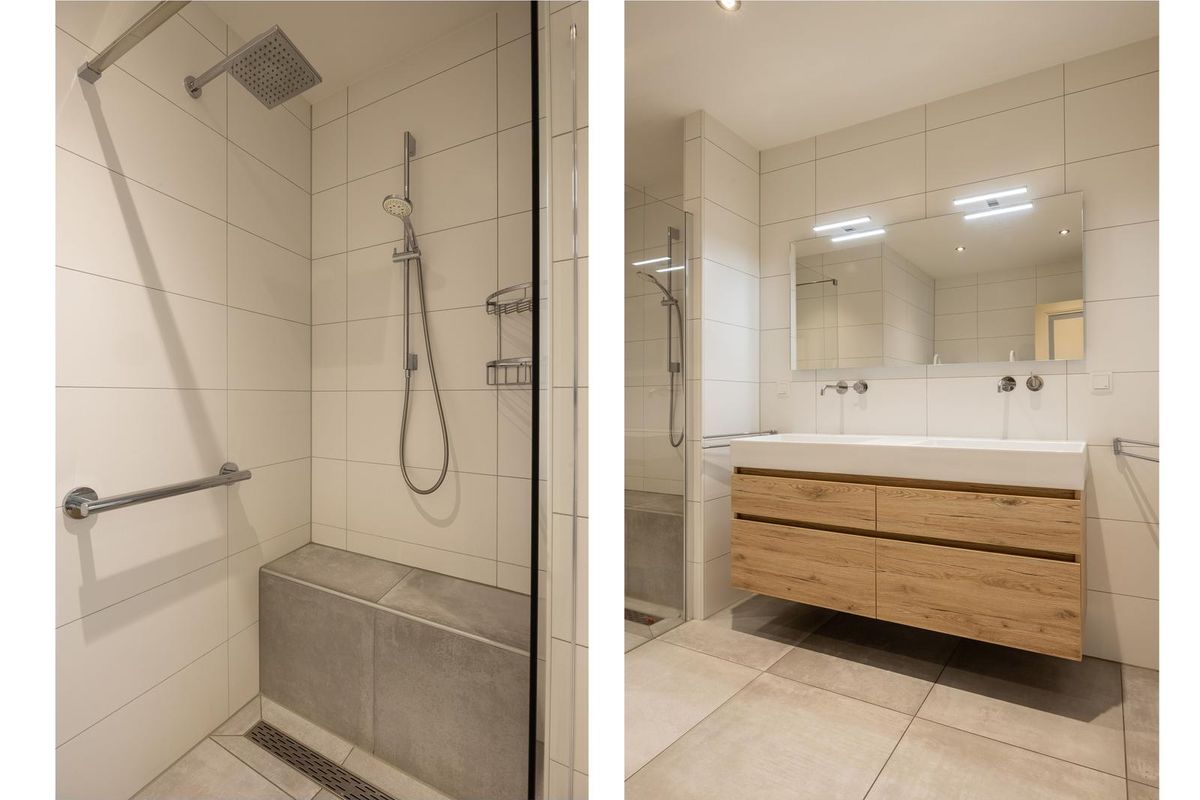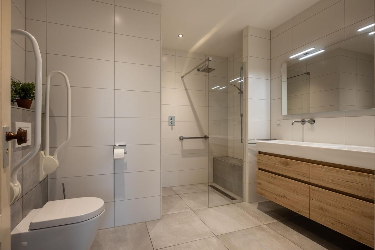 De ruime slaapkamer aan de voorzijde van de woning geeft toegang tot de gemoderniseerde badkamer voorzien van een stortdouche, dubbele wastafel met meubel en een zwevend toilet en is afgewerkt met elegante witte tegelwanden en lichtgrijze vloertegels met elektrische vloerverwarming.