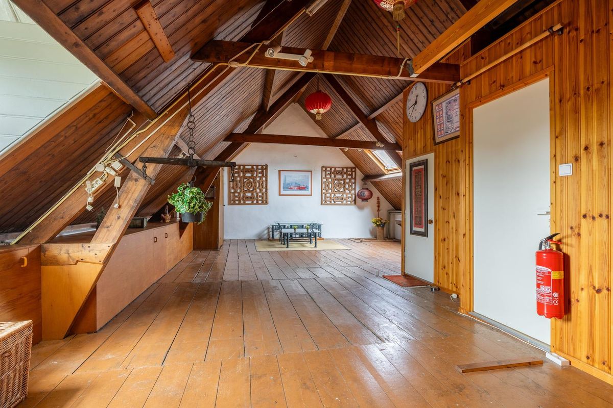 Via de wenteltrap in de woonkamer bereikt u de bovenverdieping. Via de overloop komt u in een open ruimte terecht welke is afgewerkt met houten kraaldelen, steunbalken en een houten vloer. Tegen de achterwand zijn de cv-installatie en de omvormer van de 21 zonnepanelen opgesteld. De tweede slaapkamer en badkamer bevinden zich aan de achterzijde van de woning. De slaapkamer is voorzien een vaste kast en is afgewerkt met houten wand- en vloerafwerking en met vloerbedekking. De badkamer is voorzien van een douchecabine, wastafel en een toilet.