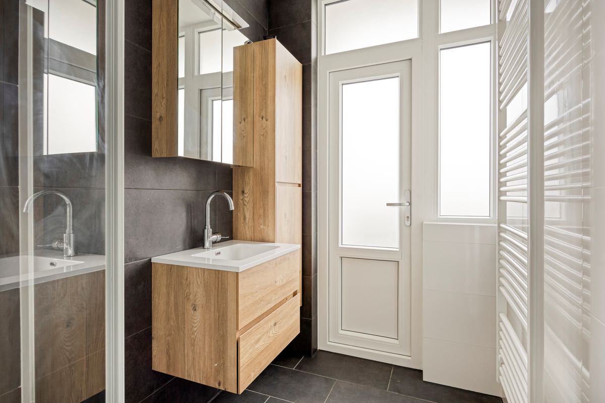 • Badkamer voorzien van douchecabine, wastafelmeubel met bijbehorende spiegelkast + wandkast en design radiator: