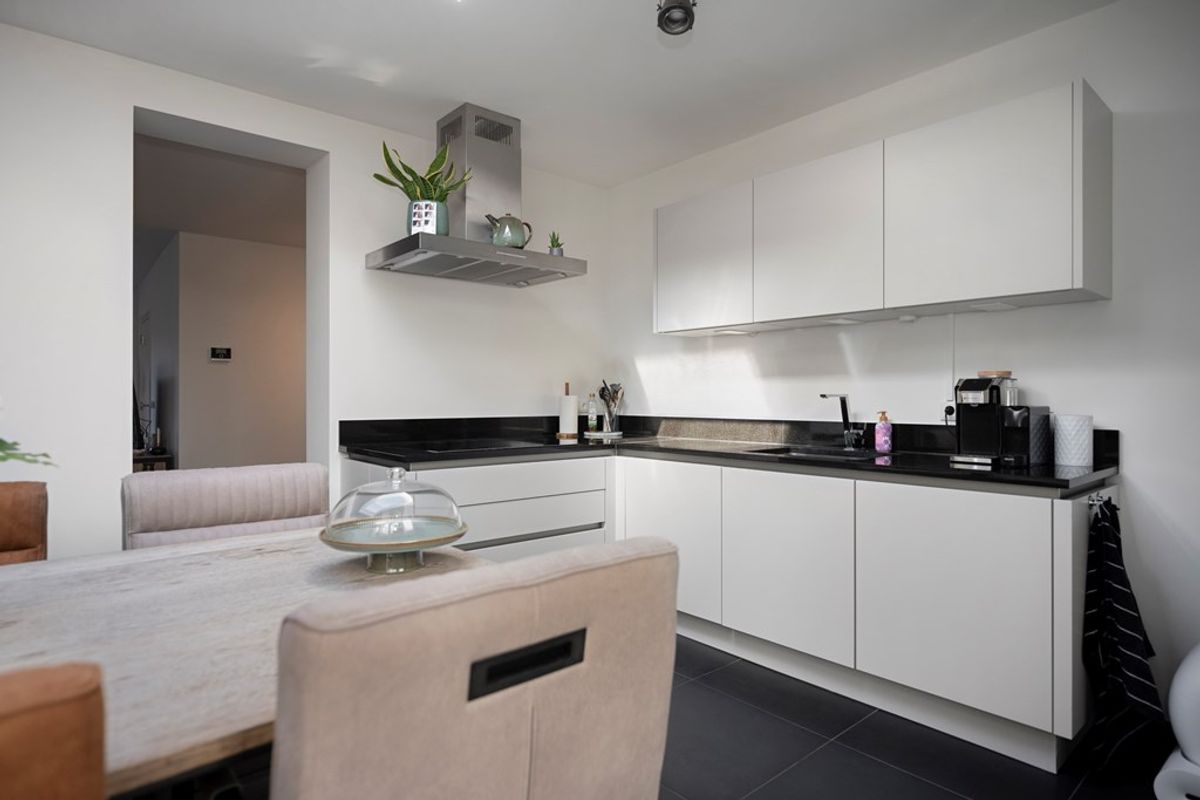 Sfeervolle, lichte woonkamer met een achtergelegen ruime aanbouw alwaar zich de open keuken bevindt. Door de aanwezige lichtkoepel en de openslaande deuren naar de tuin, is hier heerlijk veel lichtinval. De keuken is voorzien van de volgende inbouwapparatuur: inductiekookplaat, afzuigkap, vaatwasser, 2 ovens (combi oven + stoomoven) en een ingebouwde koelkast.