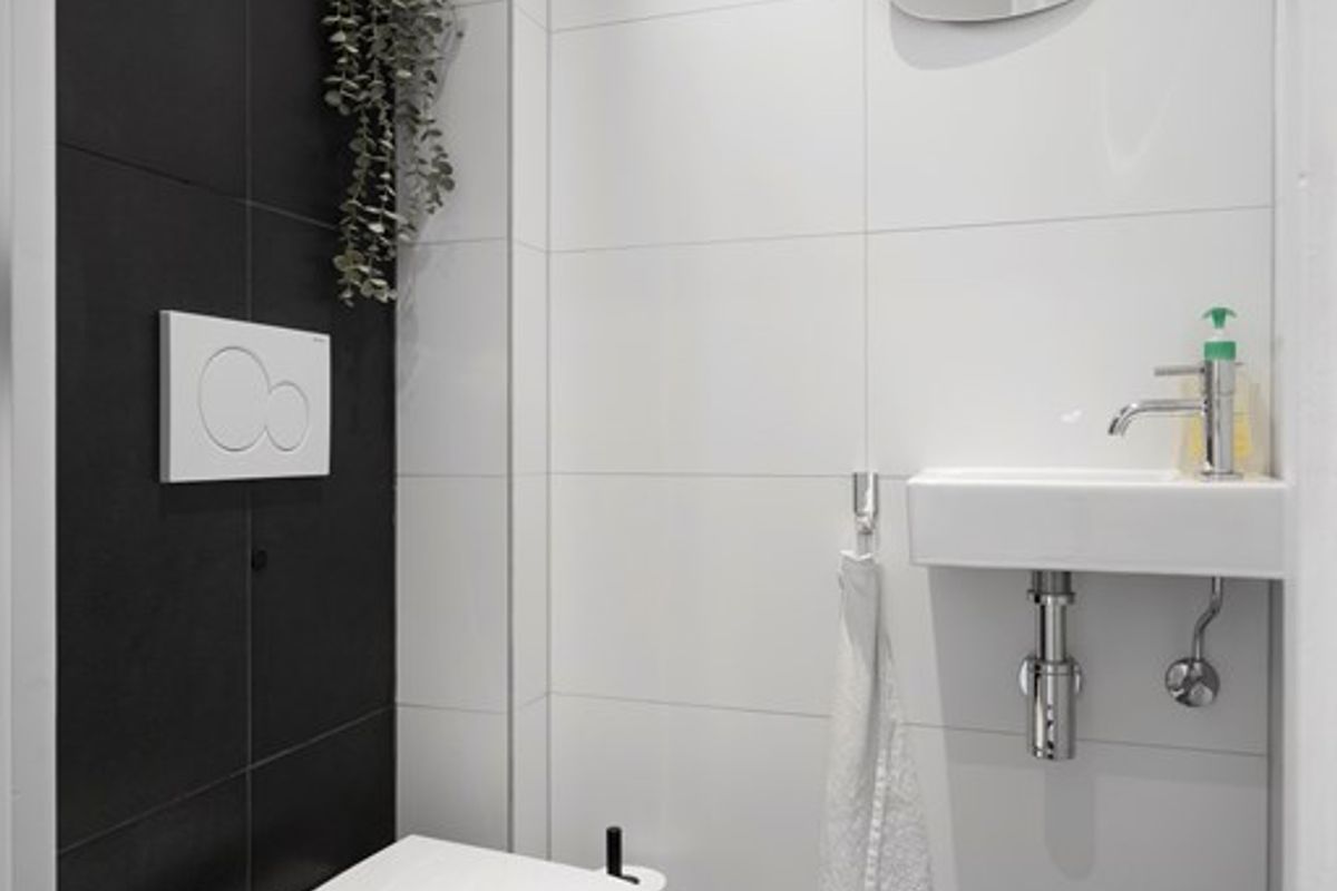 De moderne badkamer is voorzien van: een inloopdouche, wastafel met opbergmeubel en een toilet.
