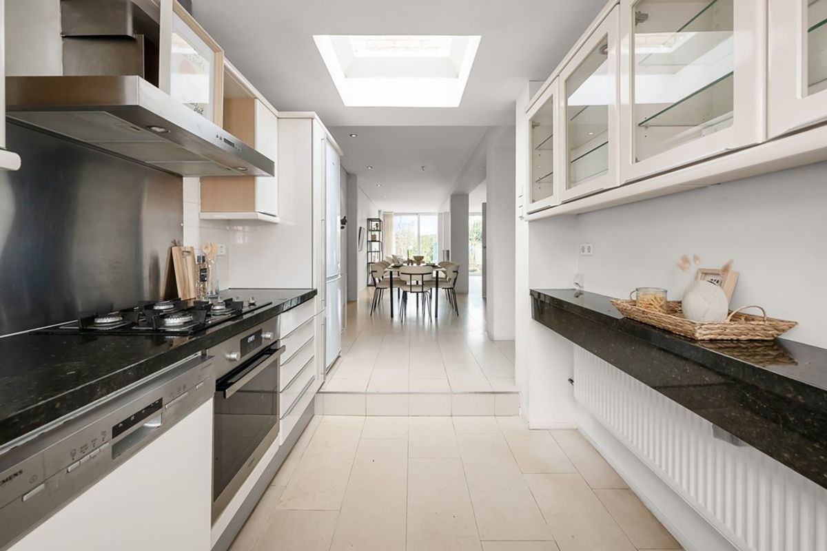 Aan de voorzijde van de woning bevindt zich de keuken in hoekopstelling, compleet met diverse inbouwapparatuur. Dankzij de lichtkoepel valt hier extra daglicht binnen, wat de ruimte een frisse en open uitstraling geeft. Vanuit de keuken heb je prettig zicht op het rustige hofje.