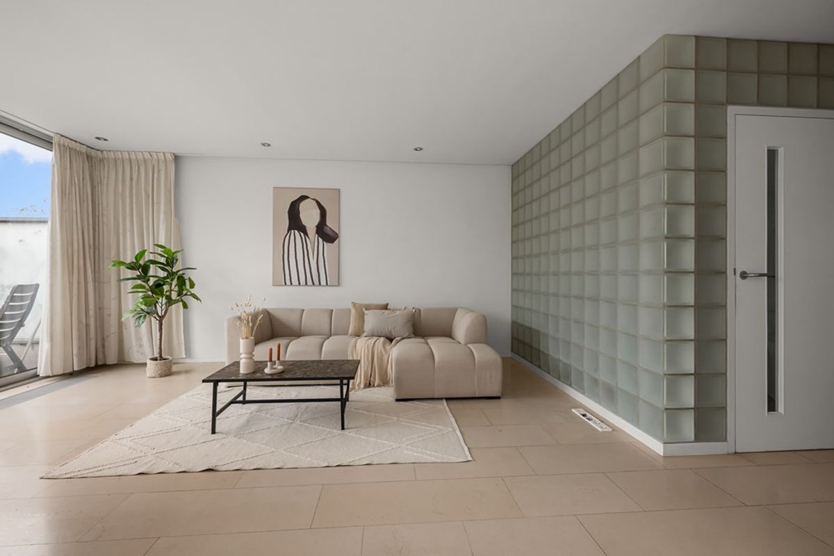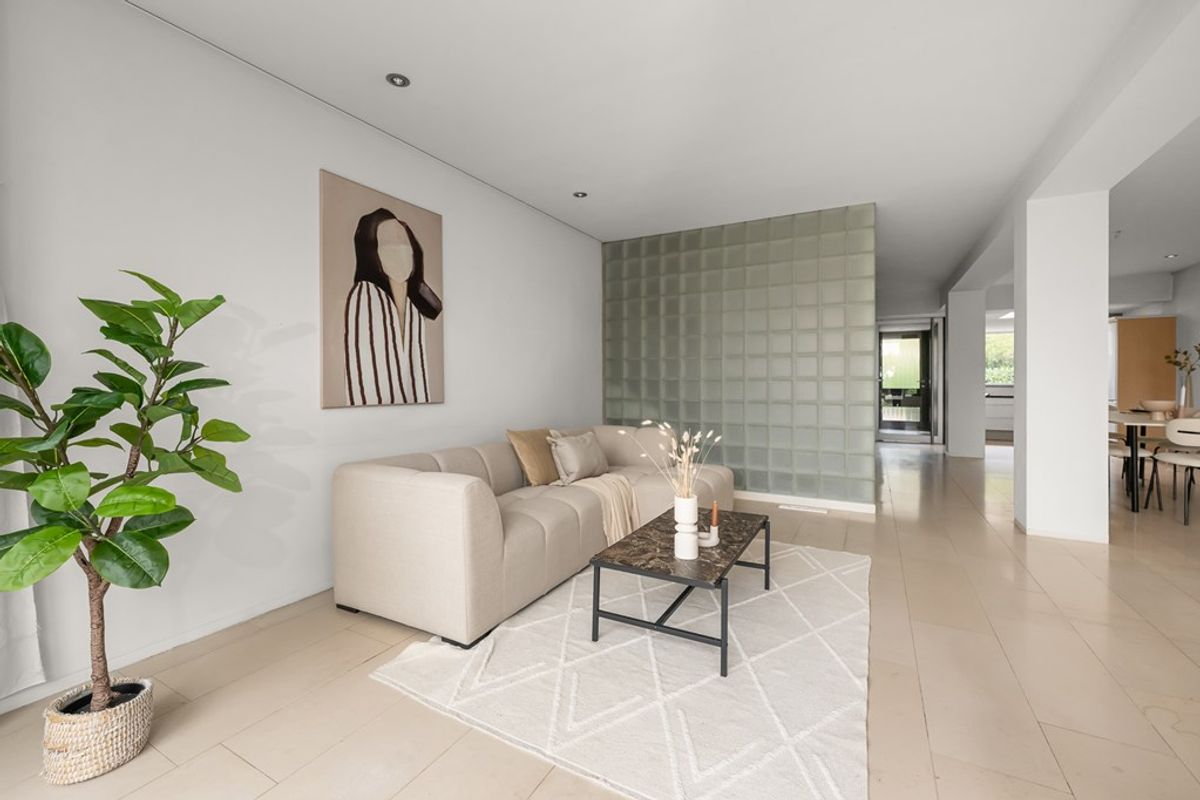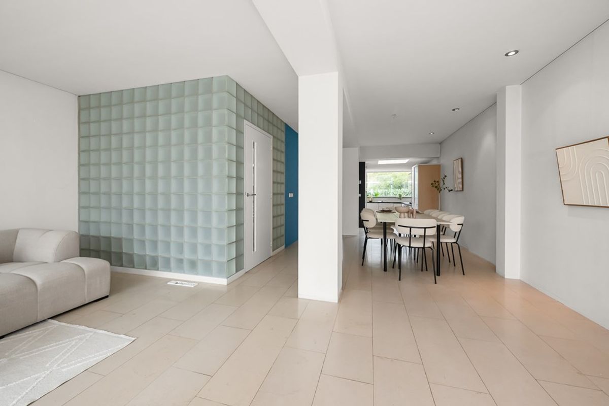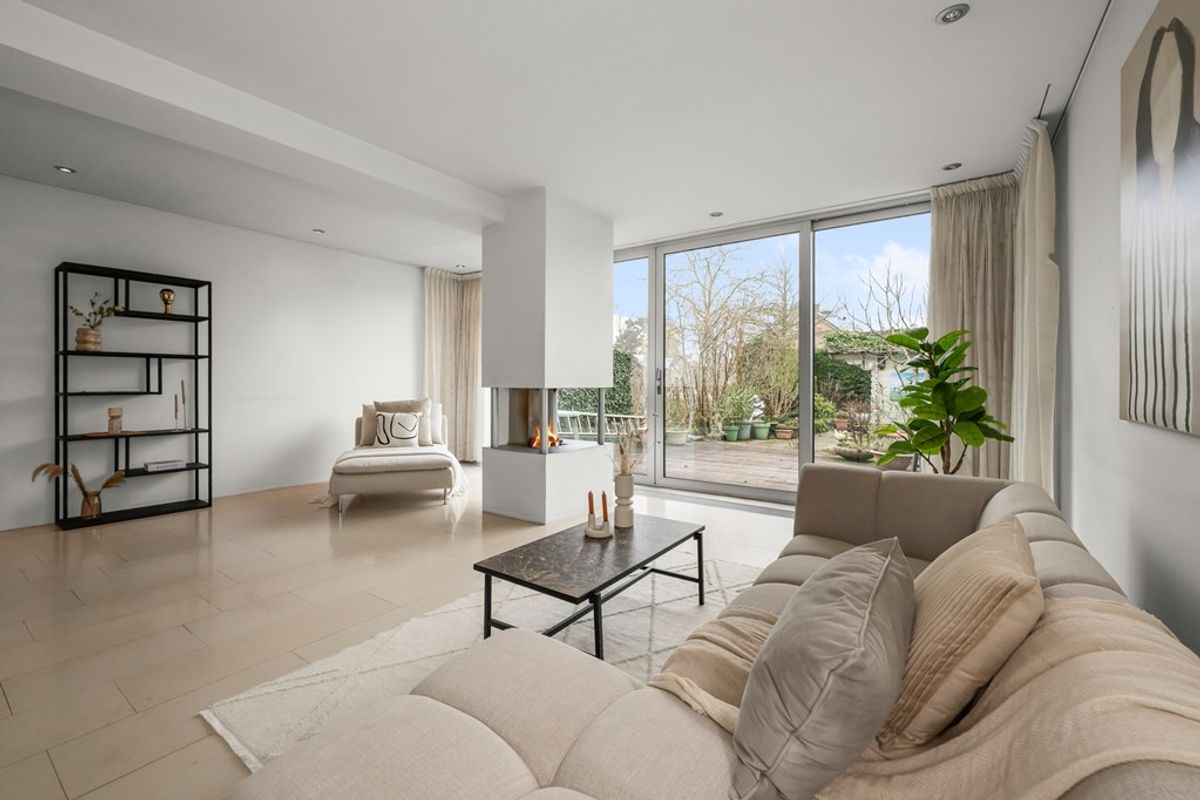 De woonkamer is tuingericht en strekt zich uit over de volledige breedte van de woning. Deze ruimte is voorzien van vloerverwarming en een sfeervolle gashaard. Via de schuifpui is er directe toegang tot de achtertuin, wat zorgt voor veel lichtinval en een goede verbinding tussen binnen en buiten.