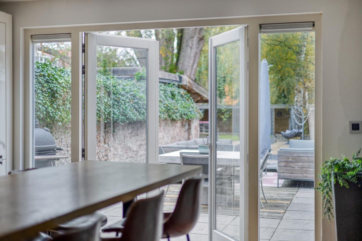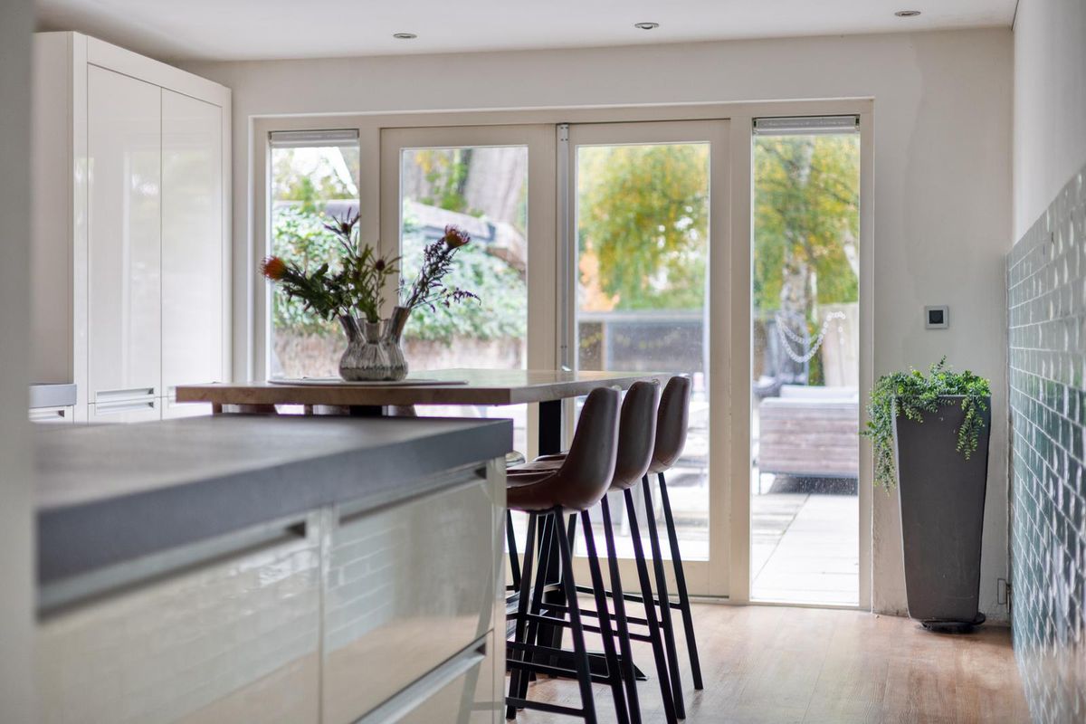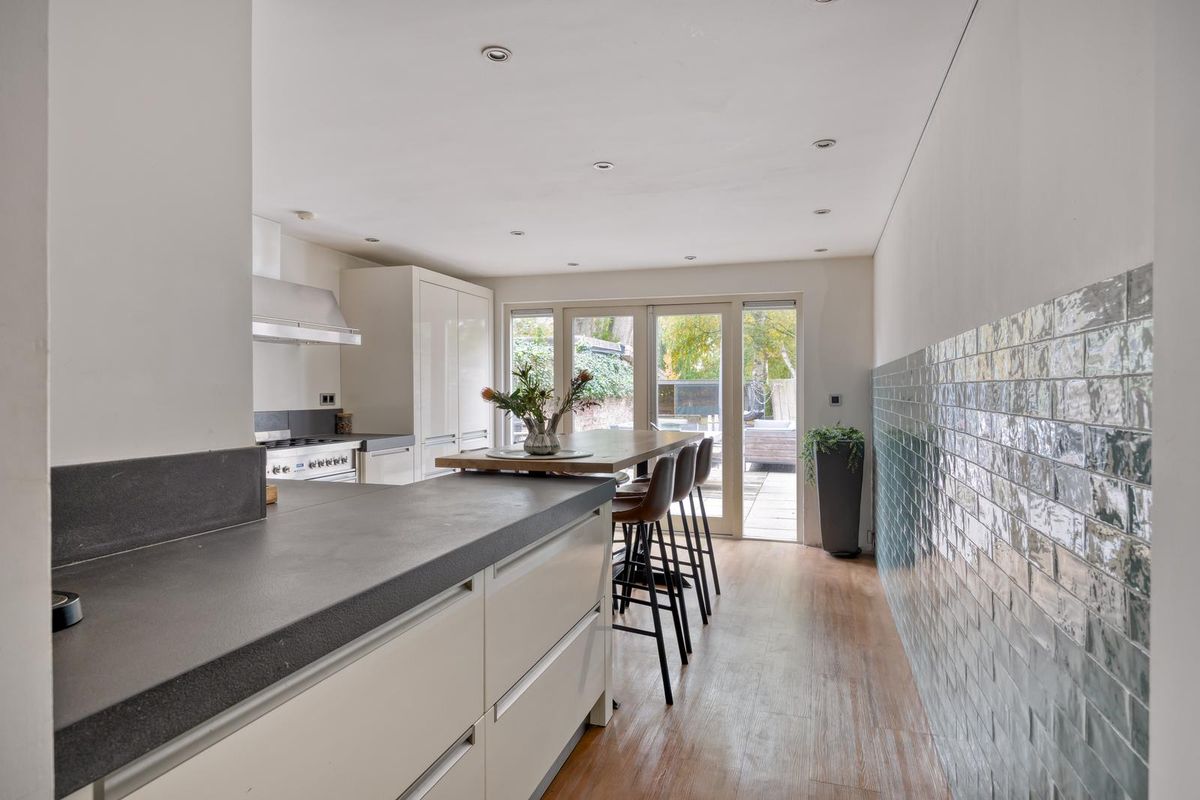 De woonkamer bevindt zich aan de voorzijde van de woning en is ruim opgezet. Dankzij de grote raampartijen geniet je van een fijne lichtinval en kun je lekker vanaf de bank naar buiten kijken. De authentieke haard zorgt voor extra gezelligheid en warmte tijdens de koudere maanden. Er is voldoende ruimte voor een royale eethoek, perfect voor lange diners met familie of vrienden. Vanuit de tweede hal stap je de moderne gesloten keuken binnen: wit afgewerkt, met ingebouwde apparatuur zoals een kookplaat, oven, koelkast, vriezer, vaatwasser en meer. De grote raampartijen en openslaande deuren verbinden de keuken naadloos met de tuin. Je kunt hier heerlijk koken én genieten van de buitenlucht. Het aanwezige barretje maakt het plaatje compleet.