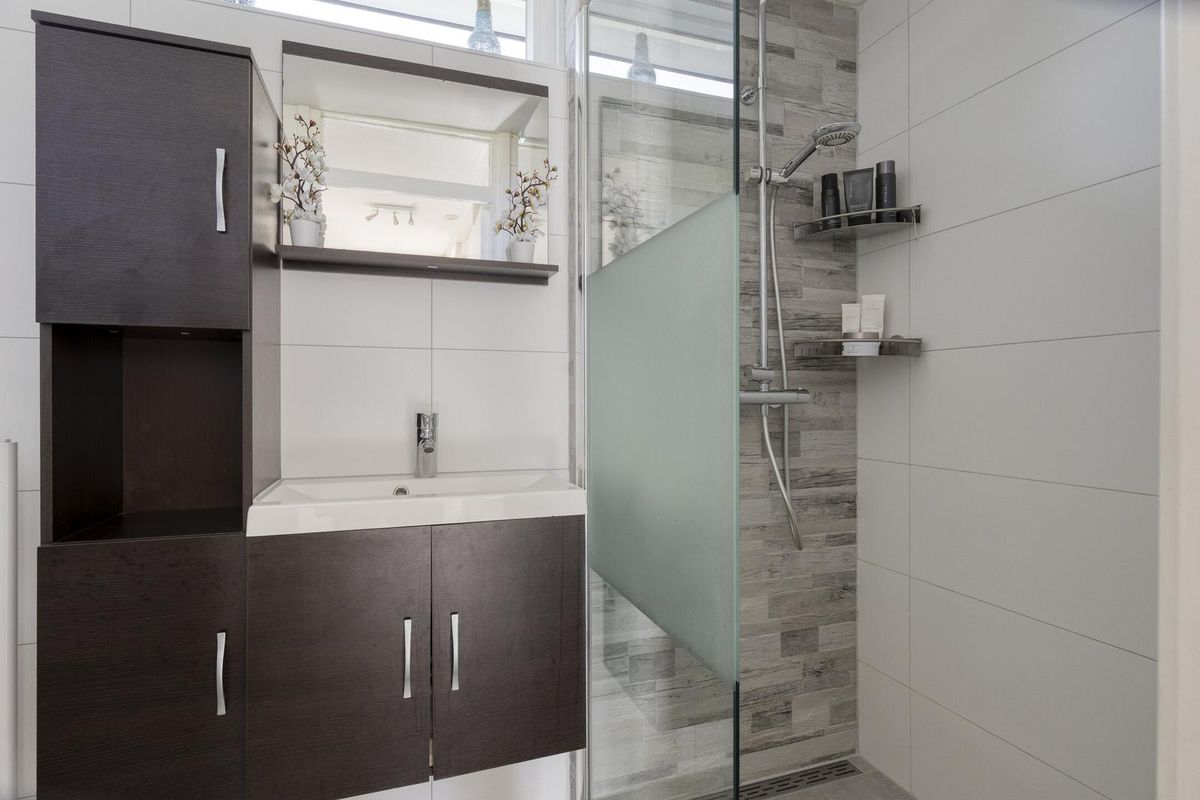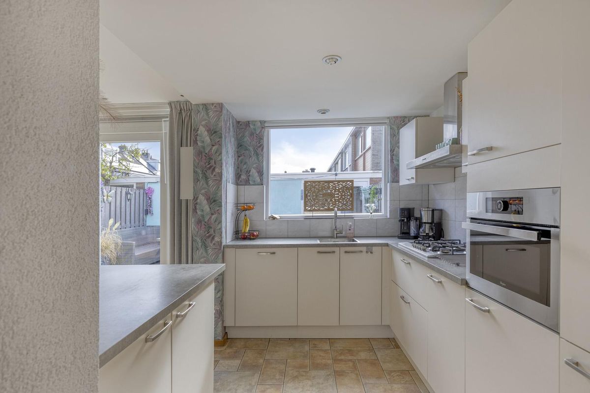 Aan de achterzijde is de woning ruim uitgebouwd, waardoor er maar liefst zeventien vierkante meter extra leefruimte is ontstaan. In deze uitbouw bevindt zich de open keuken, die in 2017 is geplaatst. De keuken is modern uitgevoerd en voorzien van diverse inbouwapparatuur, waaronder een combimagnetron, vaatwasser, vijfpits gaskookplaat, afzuigkap en een boiler. Daarnaast staat er een ruime Amerikaanse koelkast die ter overname wordt aangeboden. De uitbouw biedt bovendien een prettige verbinding met de achtertuin, waardoor binnen en buiten mooi in elkaar overlopen.