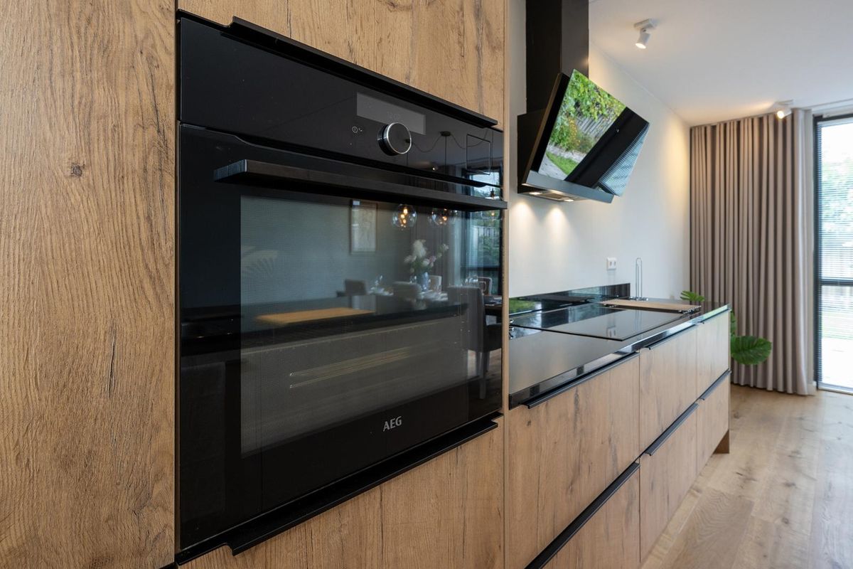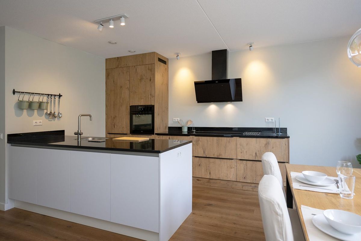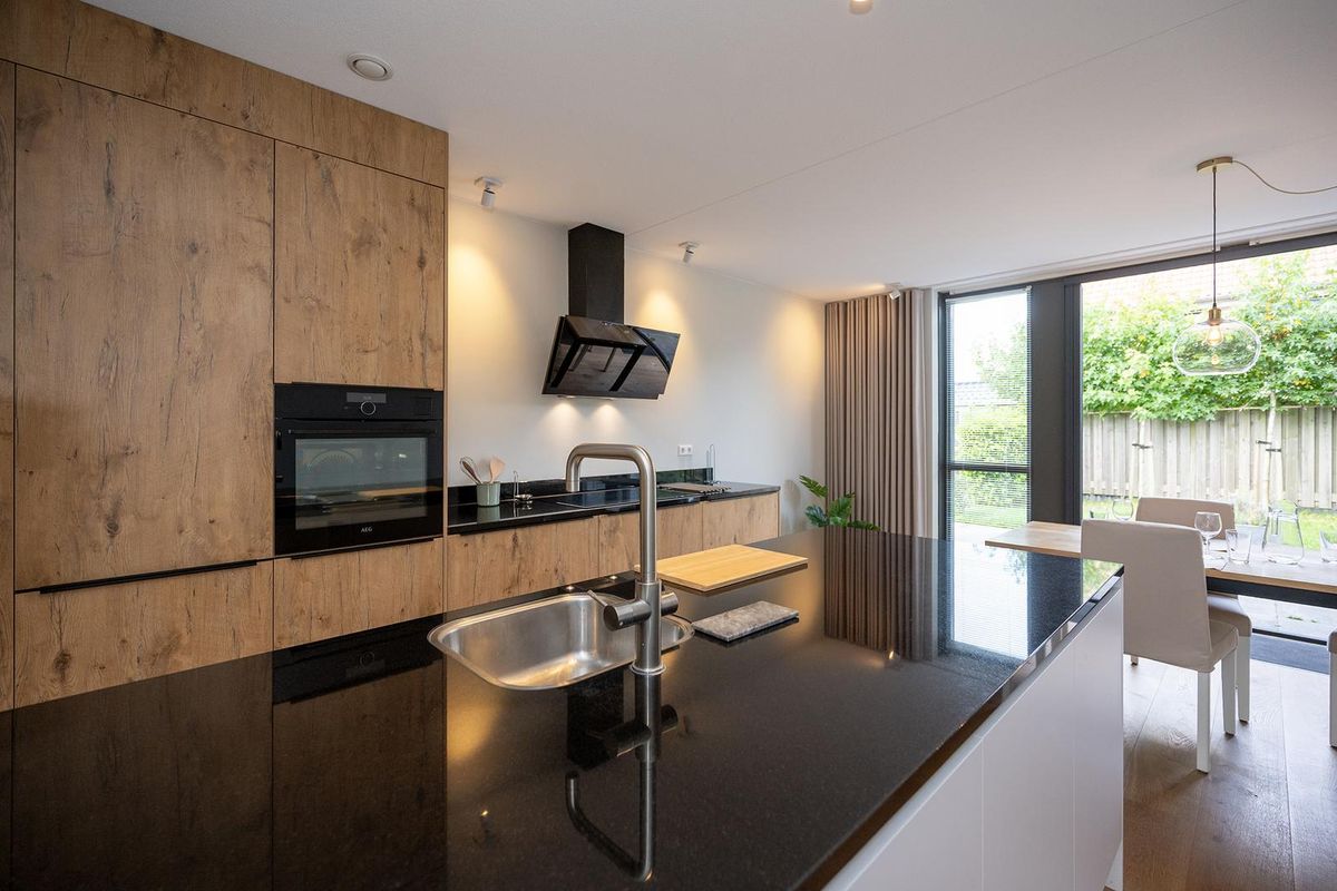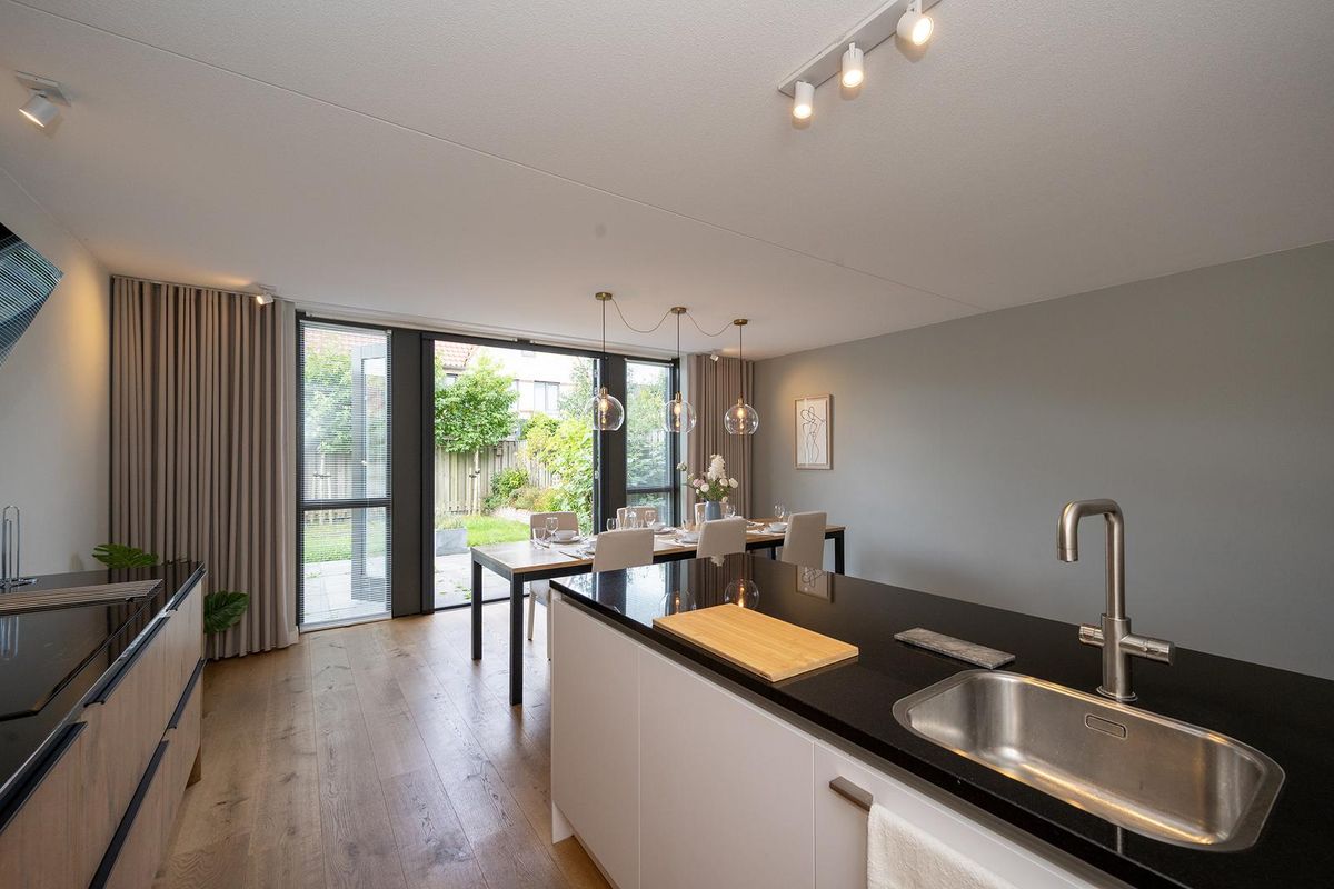 Bij binnenkomst betreedt u een ruime hal die toegang biedt tot de royale woonkamer en de trap naar de eerste verdieping. Tevens bevindt zich hier een separaat toilet. De woonkamer is voorzien van een parketvloer en grote ramen, waardoor veel natuurlijk licht binnenvalt. Aan de achterzijde van de woning bevindt zich de moderne open keuken met een grote eettafel. De keuken is uitgerust met hoogwaardige inbouwapparatuur, waaronder een luxe 5-pits inductiekookplaat, stoomoven, heetwaterkraan, koelkast en dubbele vriezer, afzuigkap, vaatwasser en voldoende kastruimte. Via de openslaande deuren is de riante tuin bereikbaar. Aan de voorzijde van de woning bevindt zich een gezellige zithoek met bank en tv.