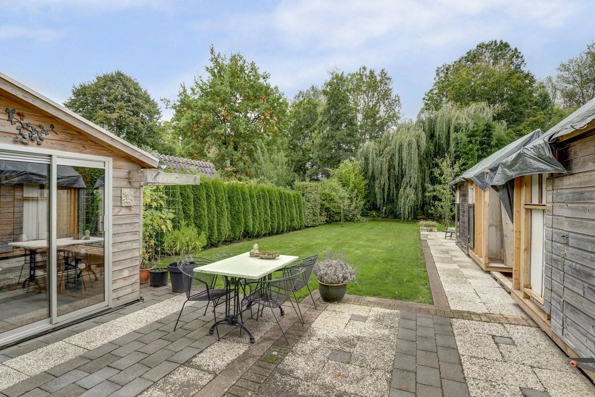 Twee-onder-een-kapwoning gelegen op een zeer royaal perceel voorzien van veel natuurlijk lichtinval, drie slaapkamers en zeer ruim bijgebouw met diepe tuin op het zonnige zuiden.