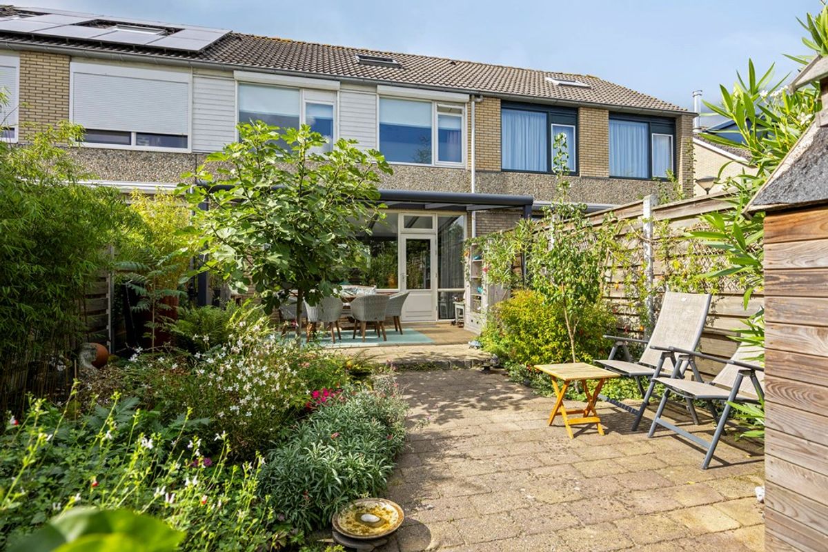 De achtertuin is fraai aangelegd en biedt zowel zon- als schaduwplekken. Direct achter de woning is een ruim terras met overkapping, ideaal om het hele jaar door buiten te zitten. Verder in de tuin vind je een zonnig terras, omringd door rijke beplanting met struiken, bloemen en een jonge boom die zorgt voor een groene en sfeervolle uitstraling. Achterin staat een houten berging, praktisch voor opslag van tuingereedschap. Een verzorgde tuin met veel privacy en volop mogelijkheden om te genieten van het buitenleven.