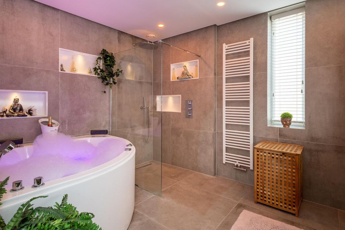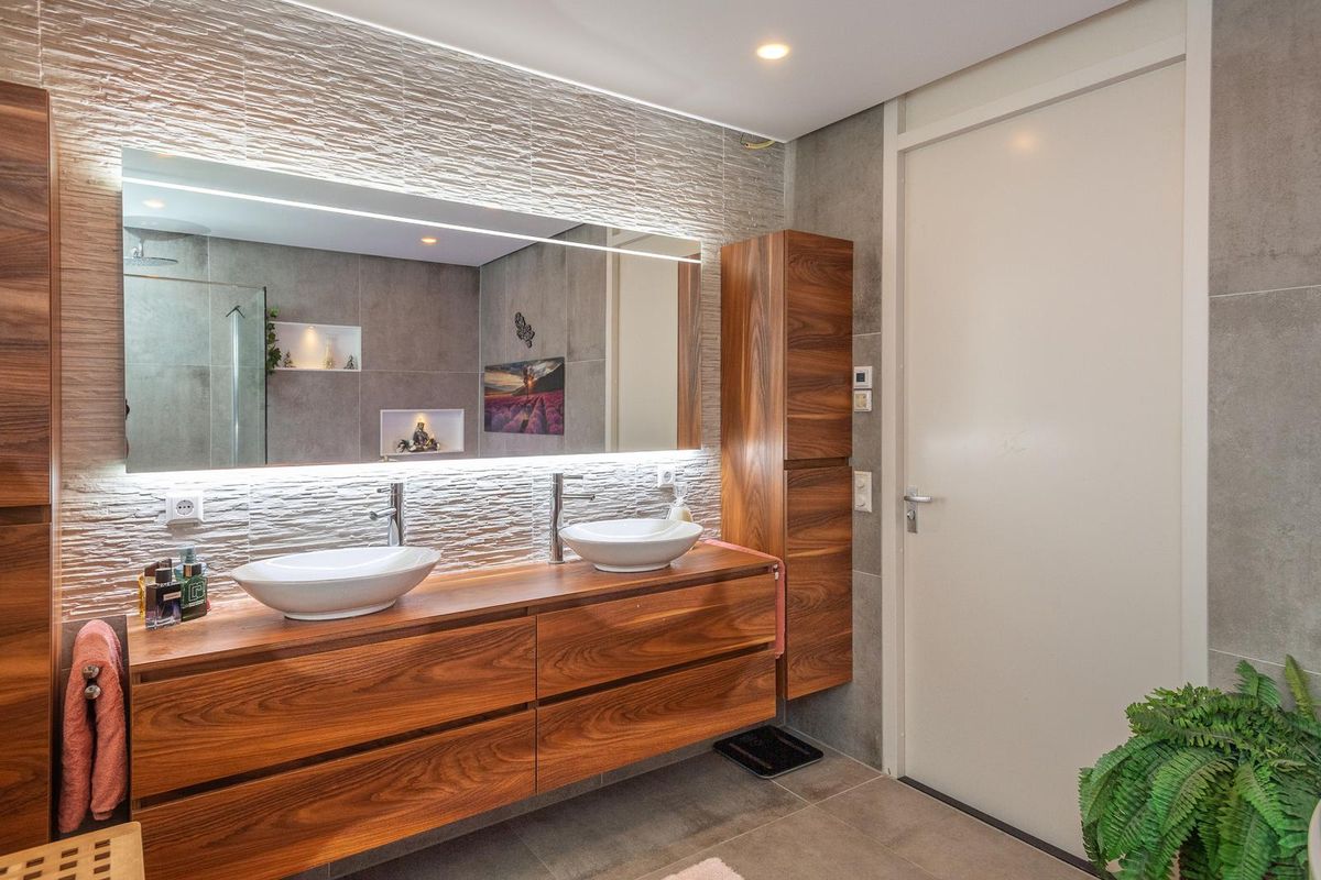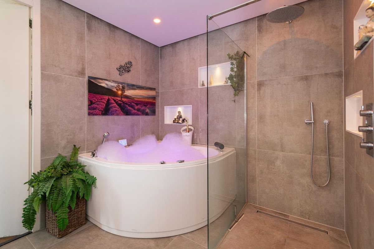 Overloop met trapopgang naar de tweede verdieping en een laminaatvloer. Geheel betegelde separate toiletruimte met zwevend toilet en fonteintje. Zeer luxe badkamer met vloerverwarming, een ruime inloopdouche met een glazen wand, stortdouche, handdouche en thermostaat kraan, een jacuzzi met ledverlichting, verlichte nissen, een handdoekenradiator, wastafelmeubel met 2 waskommen en een spiegel met ledverlichting. Daglichttoetreding via een raam.