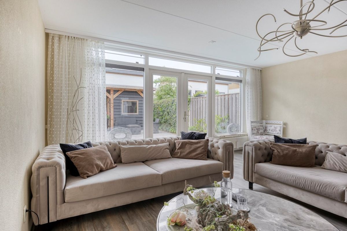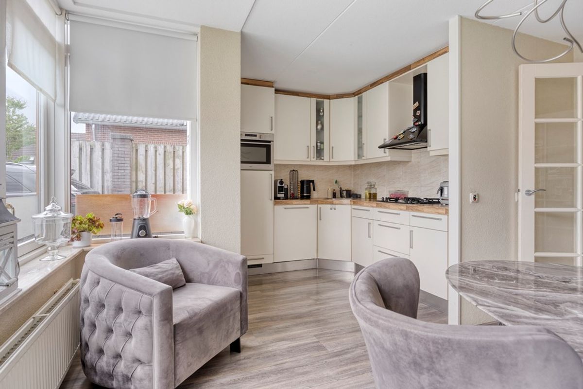 U komt binnen in een verzorgde entree met bergkasten, de trapopgang en toiletruimte. Via een tussendeur bereikt u de woonkamer: een royale leefruimte met een grote raampartij, die zorgt voor een rijke lichtinval. Dankzij de openslaande deuren naar de tuin staat deze ruimte letterlijk in verbinding met buiten. Aan de voorzijde ligt de ruime woonkeuken, gescheiden van de woonkamer door eveneens openslaande deuren. De keuken is opgesteld in een hoek en uitgerust met een combimagnetron, gaskookplaat, afzuigkap, vaatwasser en koelkast. Er is voldoende ruimte voor een gezellige eethoek.