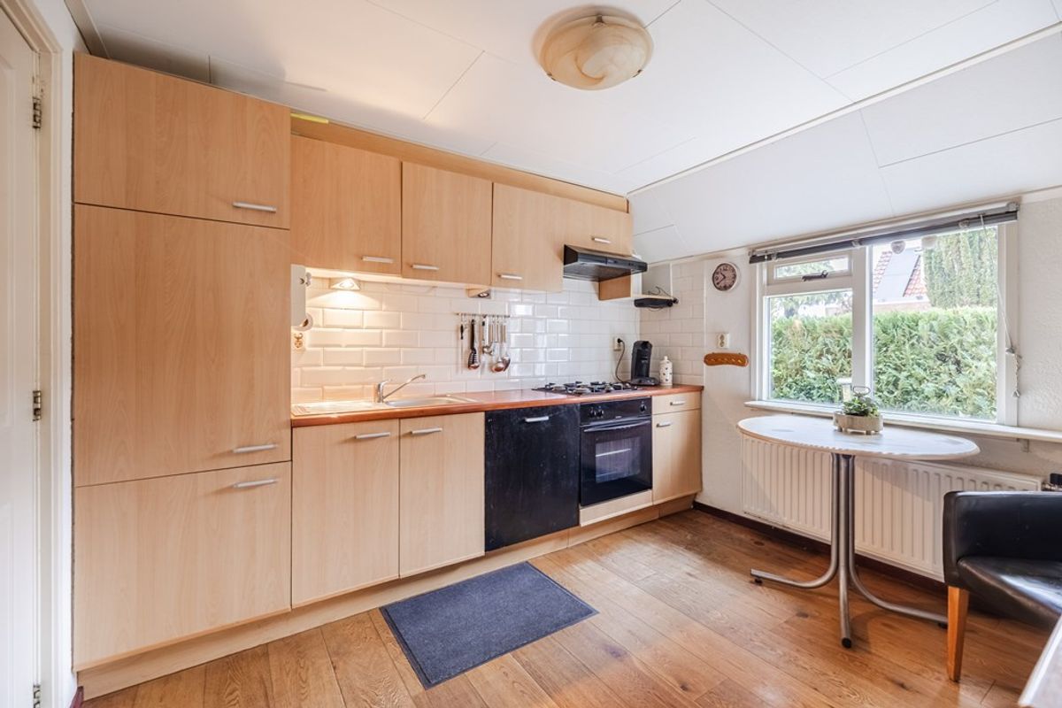 - Keuken met laminaat vloer en voorzien van koelkast, oven, vaatwasser, 4-pits gaskooktoestel en afzuigkap
