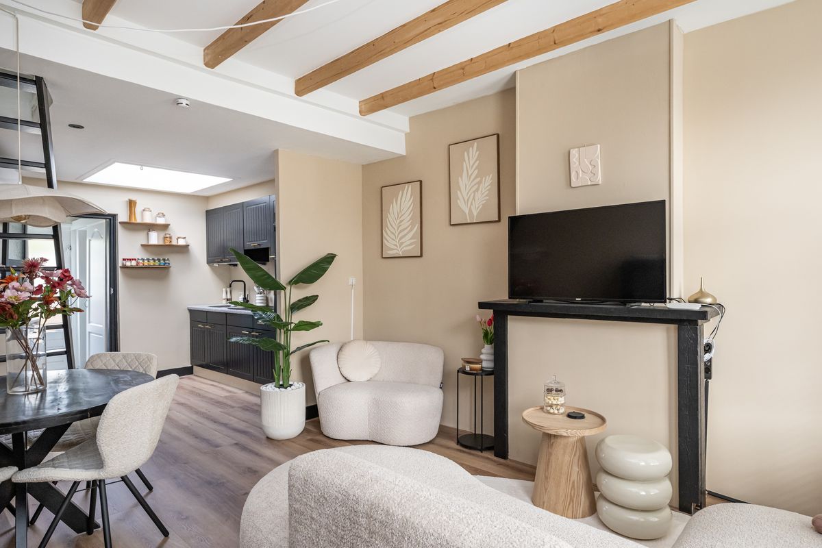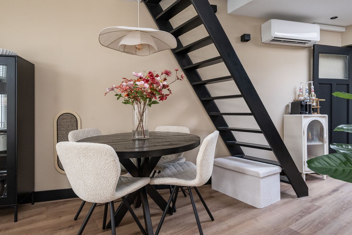 Laminaatvloer, schouw, airconditioning en balkenplafond.