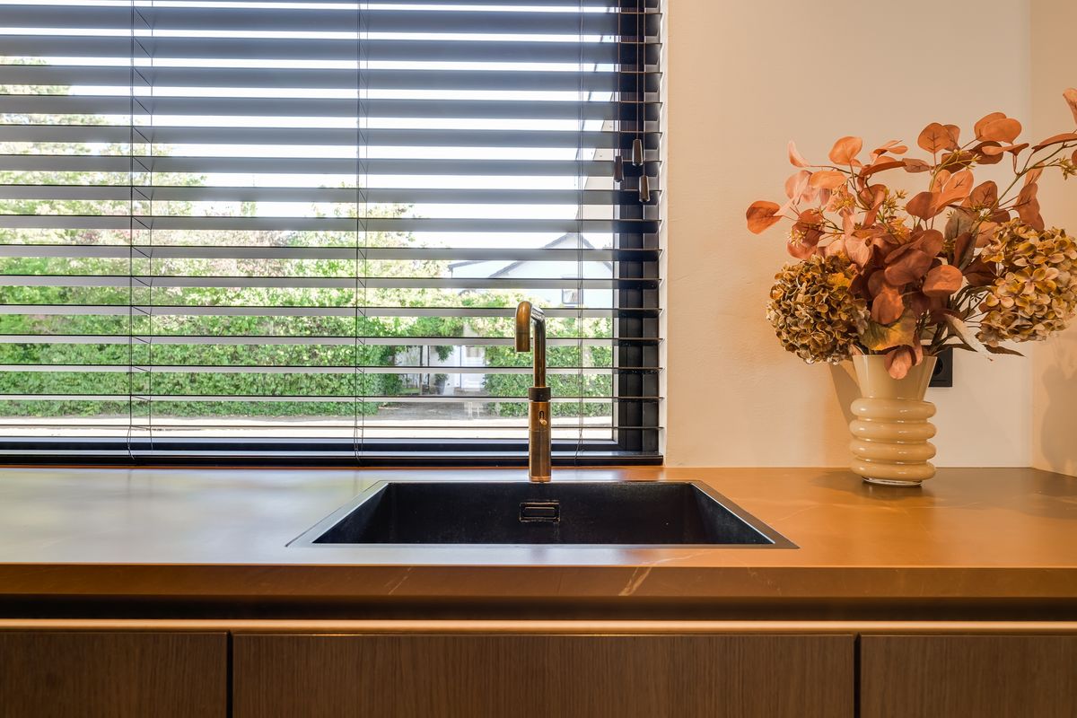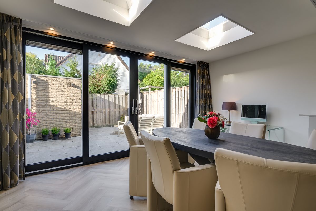 De woonkamer is echt het hart van het huis: uitgebouwd, superlicht dankzij de lichtkoepels en afgewerkt met een pvc-vloer in visgraat mét vloerverwarming. De maatwerk tv-wand sluit perfect aan bij de Siematic keuken en geeft de ruimte een moderne, luxe uitstraling. Door de openslaande deuren loop je zo de zonnige tuin in, waar de kinderen spelen en jij met een goed glas wijn geniet van de laatste zonnestralen. Zuidwesten, dus gegarandeerd die gouden avondzon.