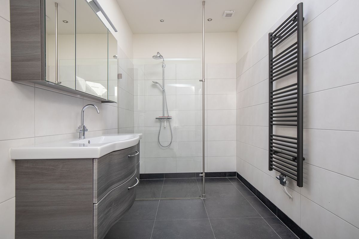 Stairs from the hallway lead to the first floor, where you'll find the master bedroom, a spacious second bedroom, and a smaller third room. The master bedroom includes an additional area with built-in wardrobes, functioning as a walk-in closet. The balcony, approximately 8m², is also accessible from this floor and faces the same direction as the garden. The bathroom features a walk-in shower, washbasin, and towel radiator. A second separate toilet is also located on this floor.