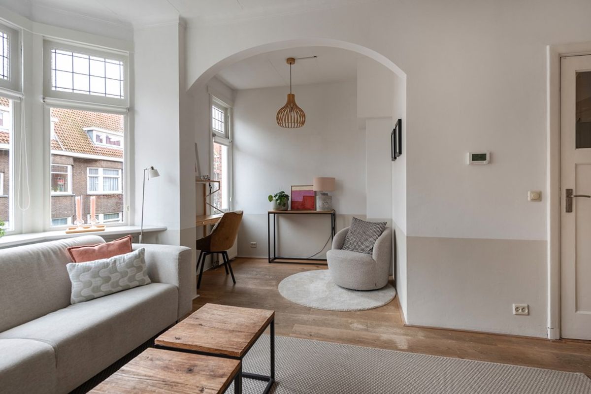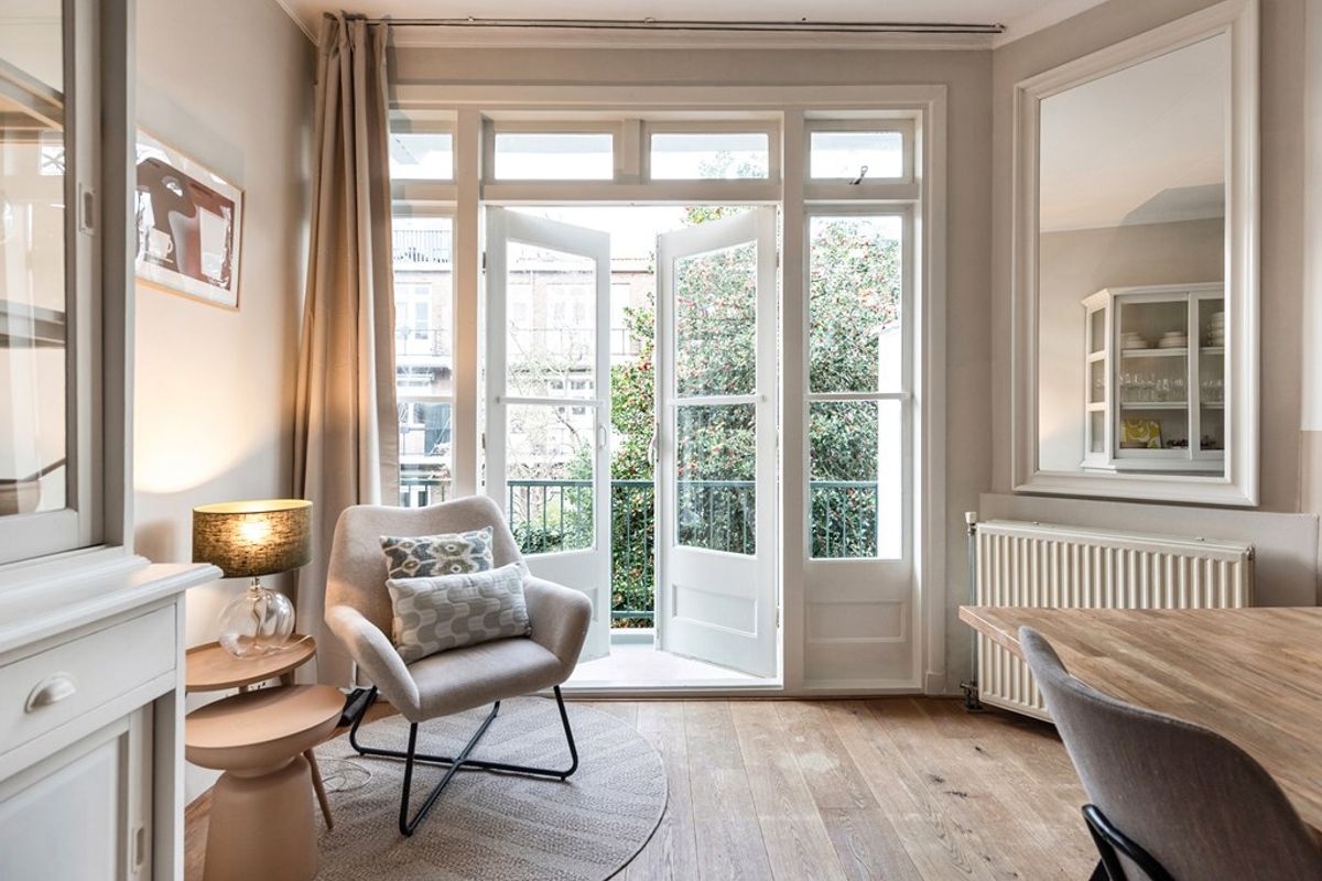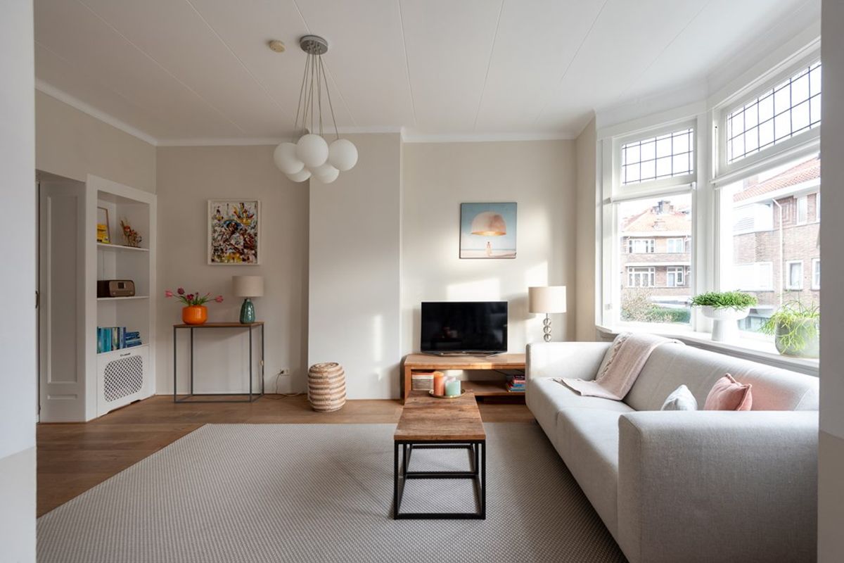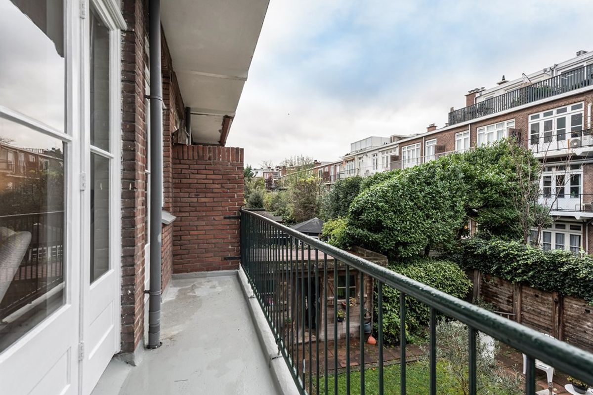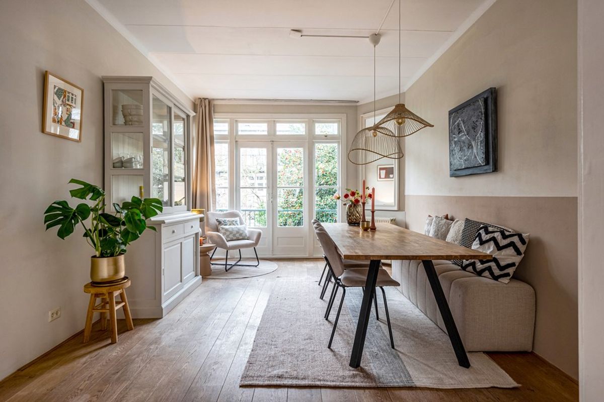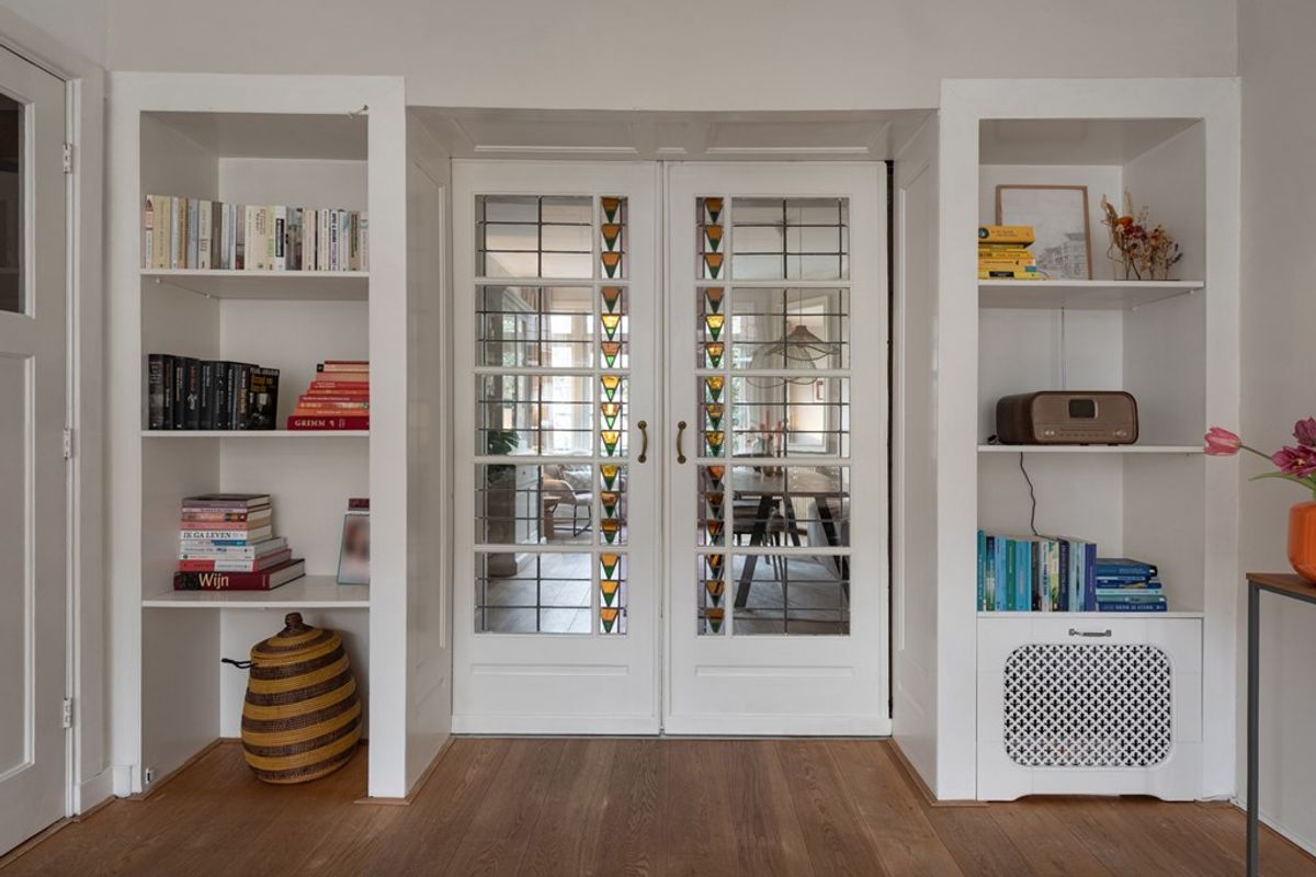 De lichte L-vormige doorzonwoonkamer met houten vloer strekt zich uit over de volledige diepte van de woning, van voor- tot achtergevel. Via de originele ensuite deuren voorzien van glas in lood zijn de woon- en eetkamer van elkaar te scheiden. Zowel vanuit de eetkamer als vanuit de separate keuken is er toegang tot het balkon, dat is voorzien van een handige opbergkast.