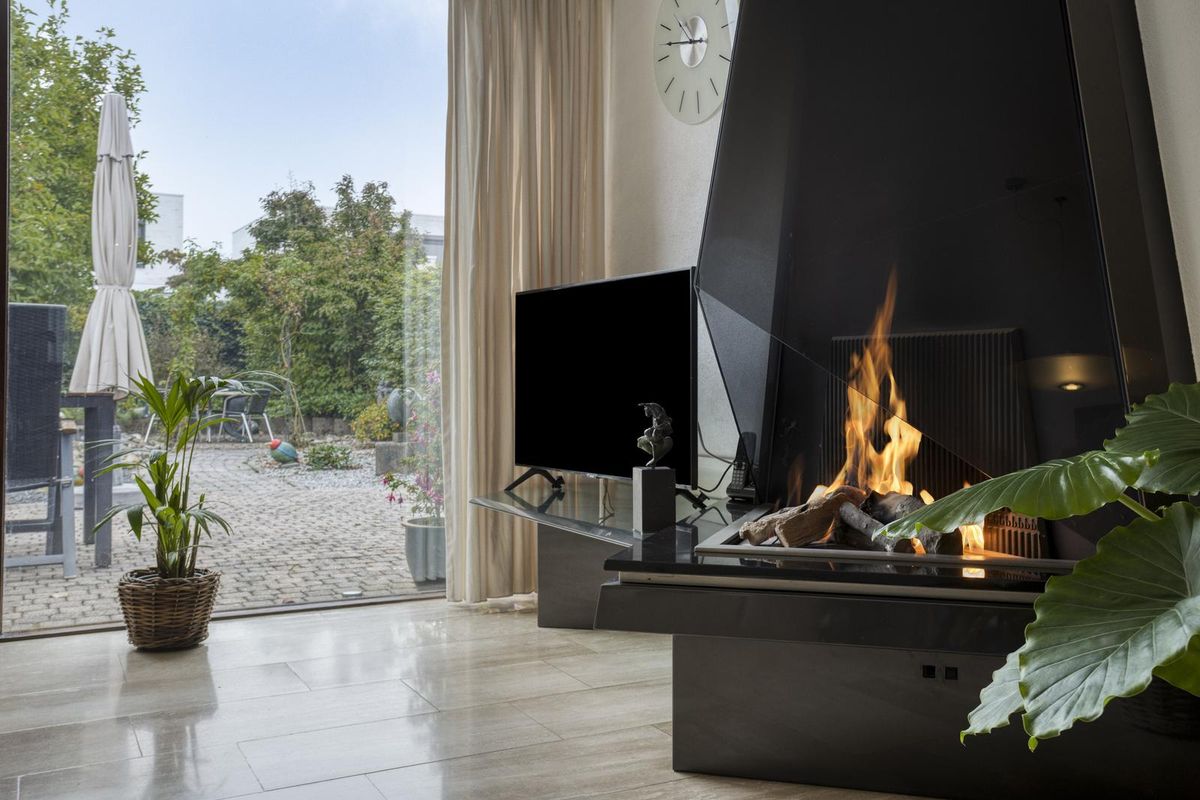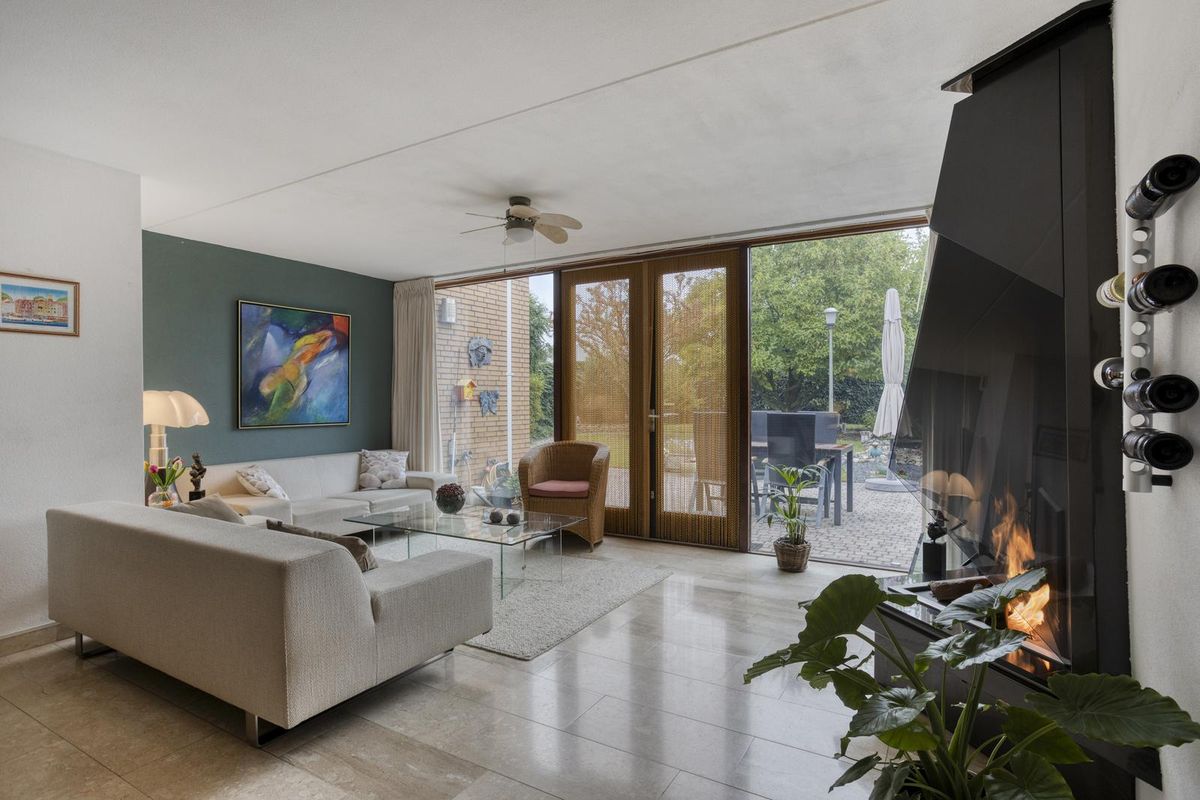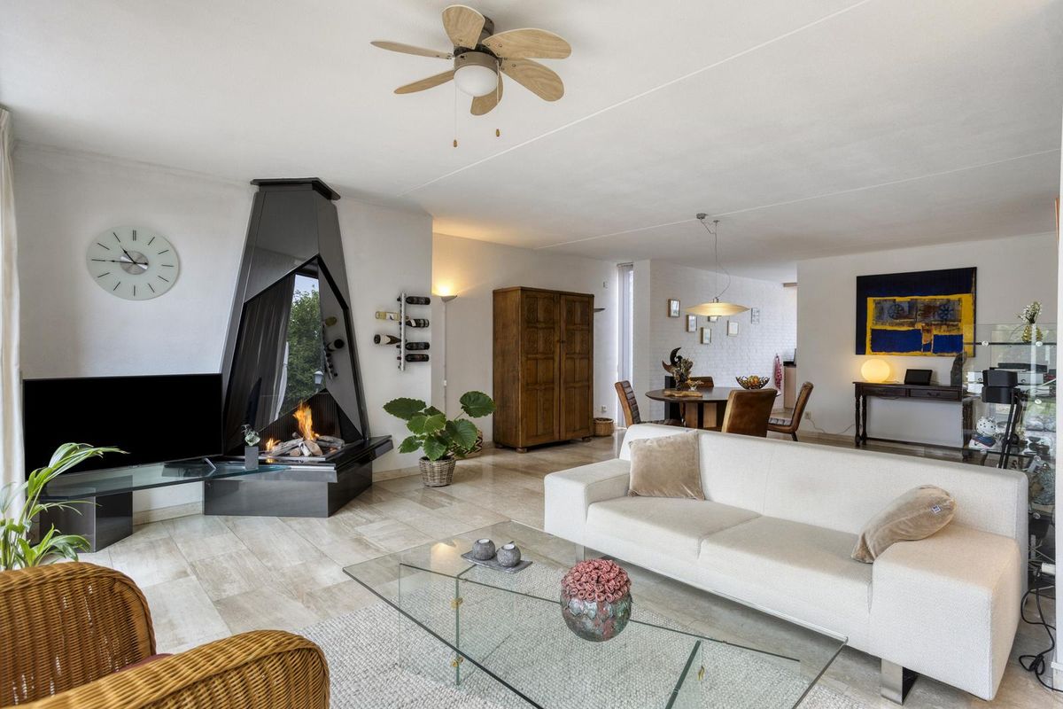 Royale Z-vormige woonkamer (61m²) met openslaande tuindeuren en gashaard.