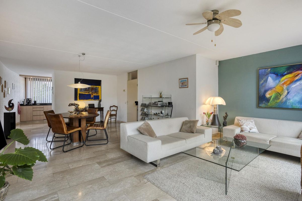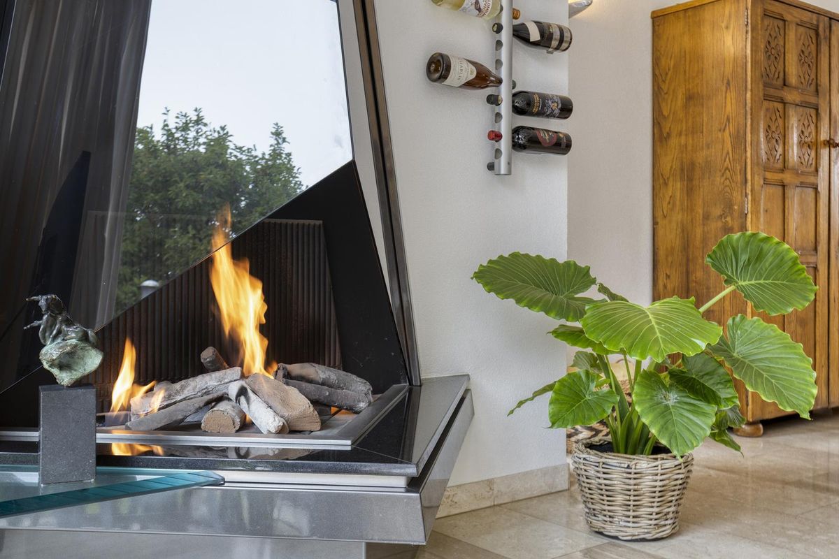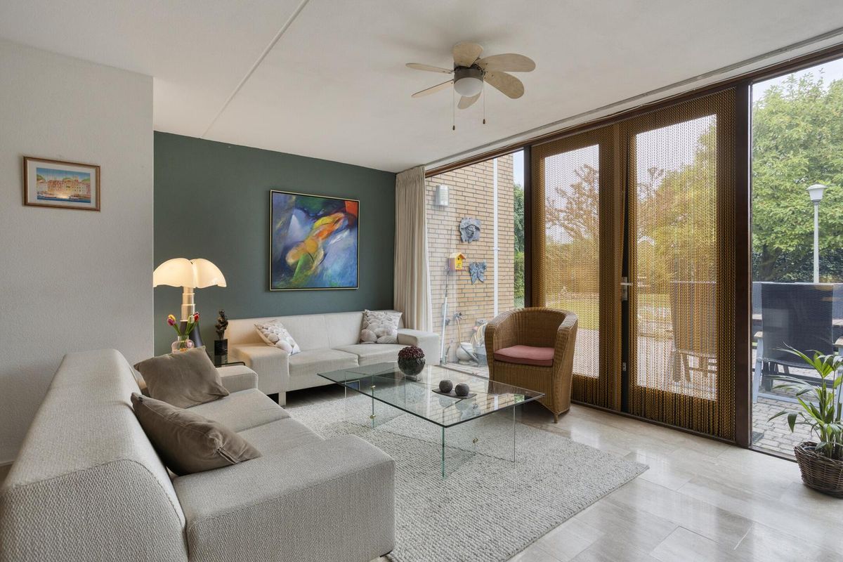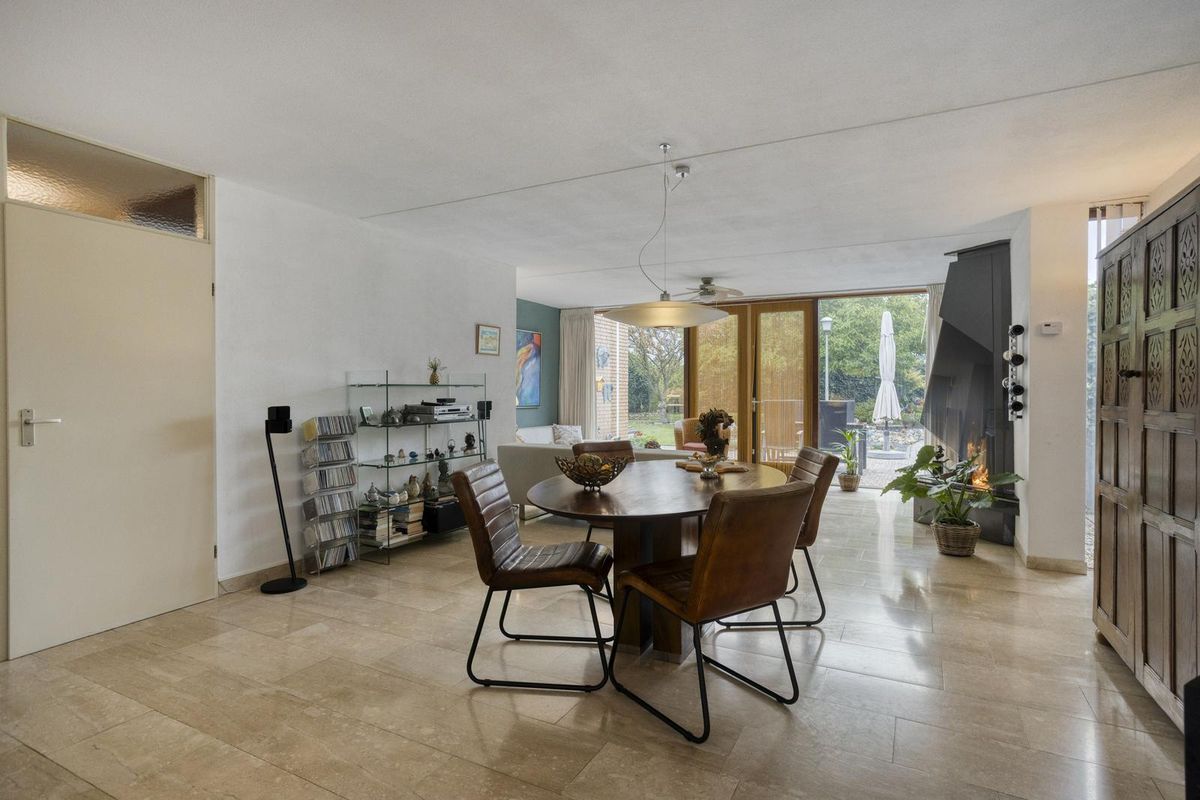 Royale Z-vormige woonkamer (61m²) met openslaande tuindeuren en gashaard.