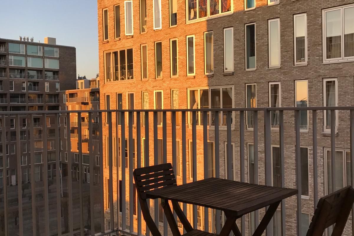 Vanuit de woonkamer heb je toegang tot het ruime balkon, waar je heerlijk kunt ontspannen en genieten van het uitzicht over het Westerdok.