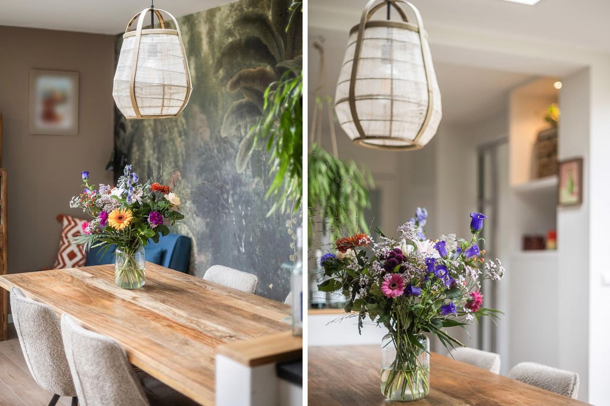 Vanuit de hal loop je door naar de (half) open keuken en woonkamer. De lichte laminaatvloer met brede planken, de prachtige kleurtonen en de karaktervolle ensuite deuren zorgen samen voor een sfeervolle, moderne uitstraling en een ruimtelijk gevoel.