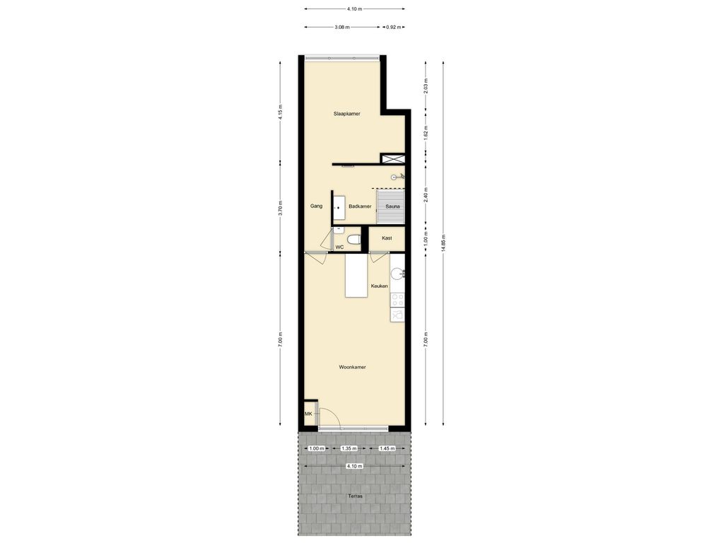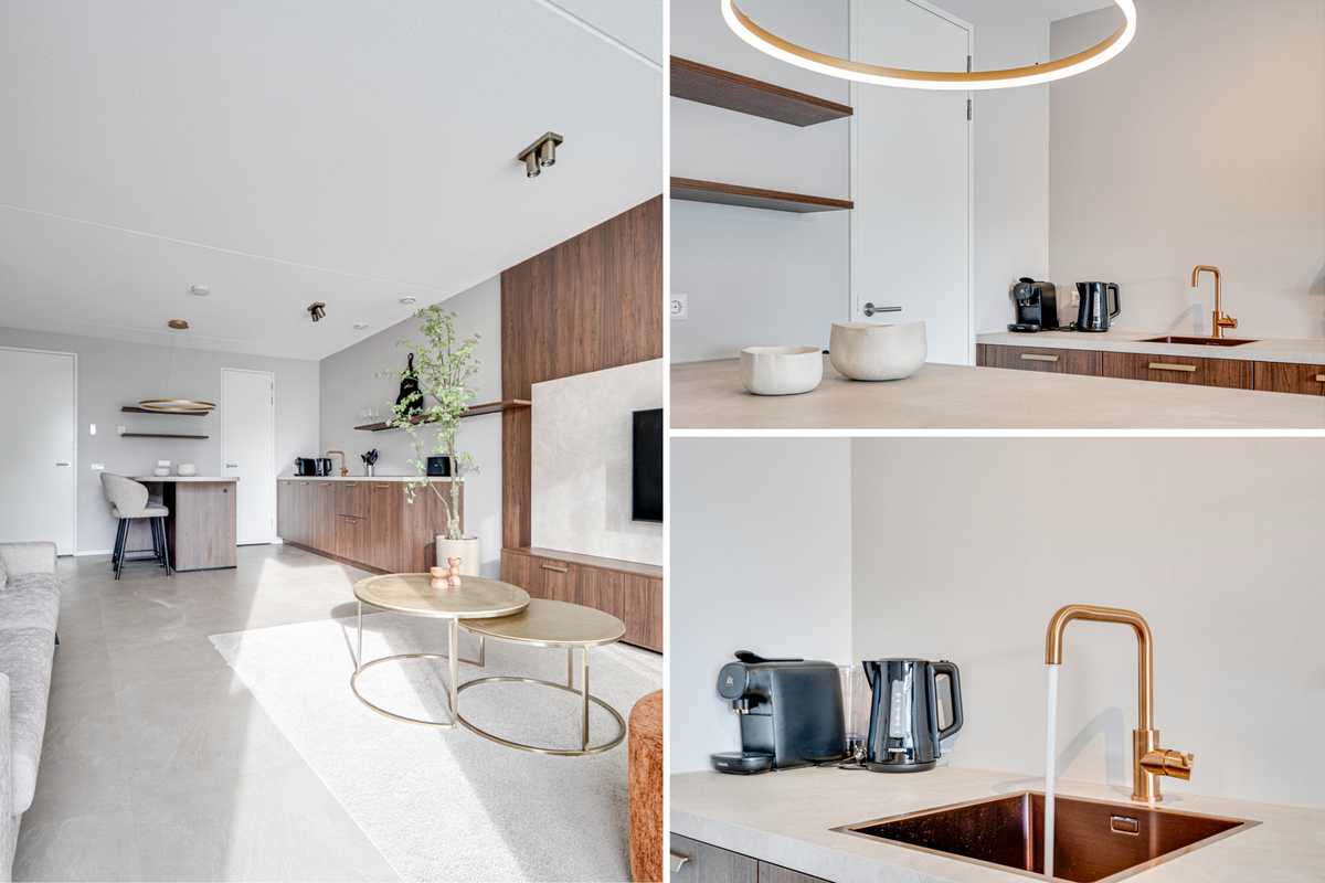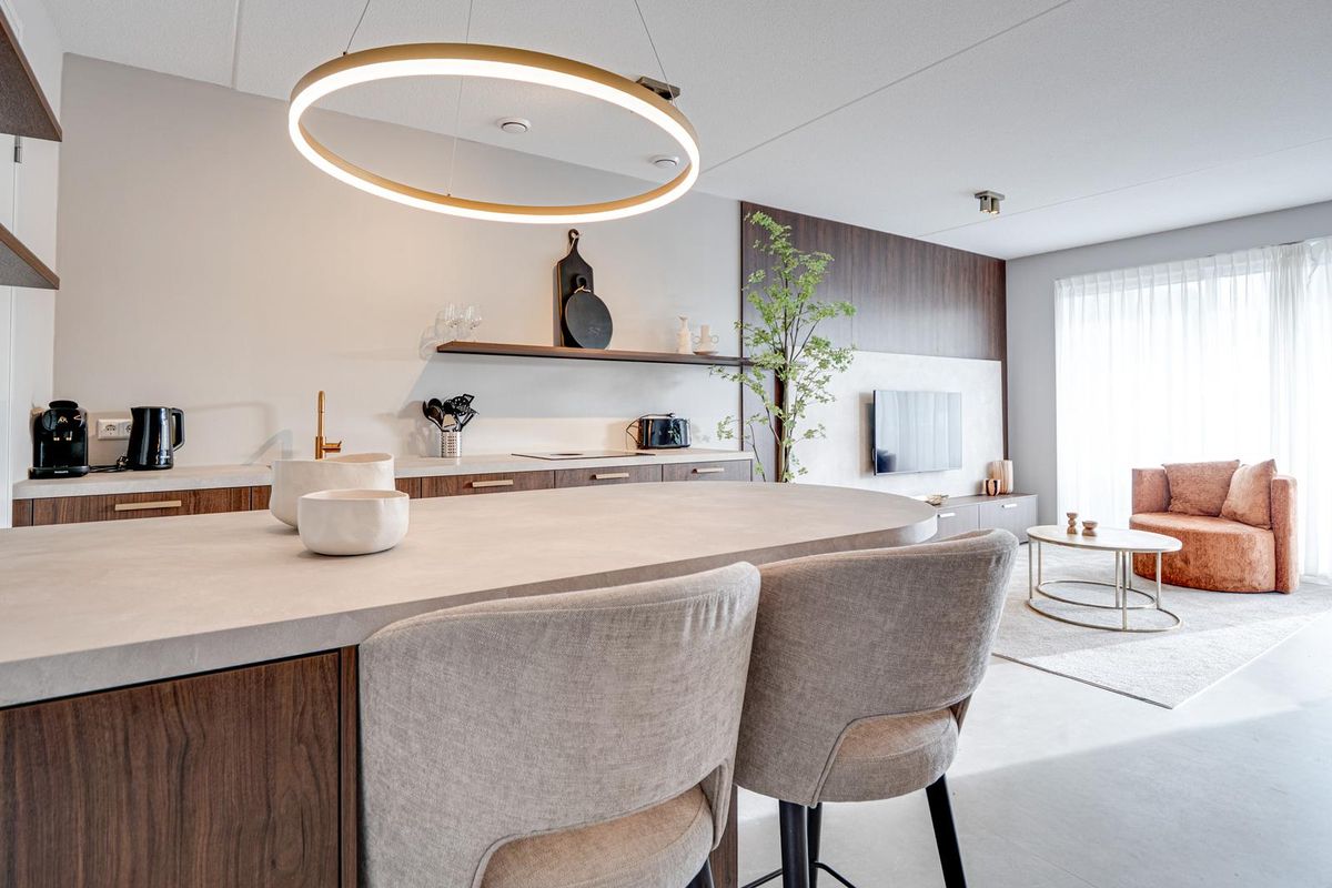 In elk appartement ervaar je direct het comfort en de luxe. De woonkamer is strak afgewerkt in neutrale tinten, wat zorgt voor een rustige, warme sfeer. De open keuken met gezellige bar vormt het hart van de woning en is volledig uitgerust met een 4-pits inductiekookplaat, combimagnetron en vaatwasser. Via de woonkamer loop je zo het eigen terras op, de perfecte plek om te ontspannen na een dag aan zee.