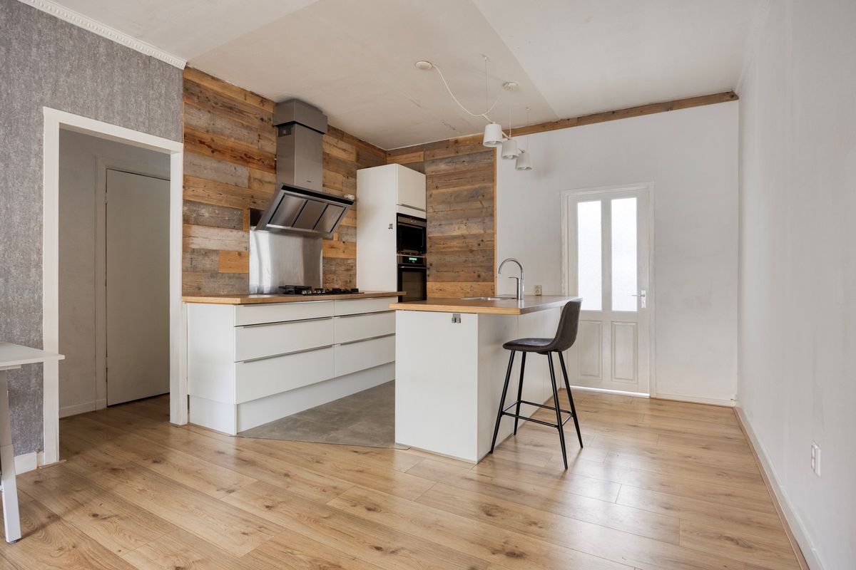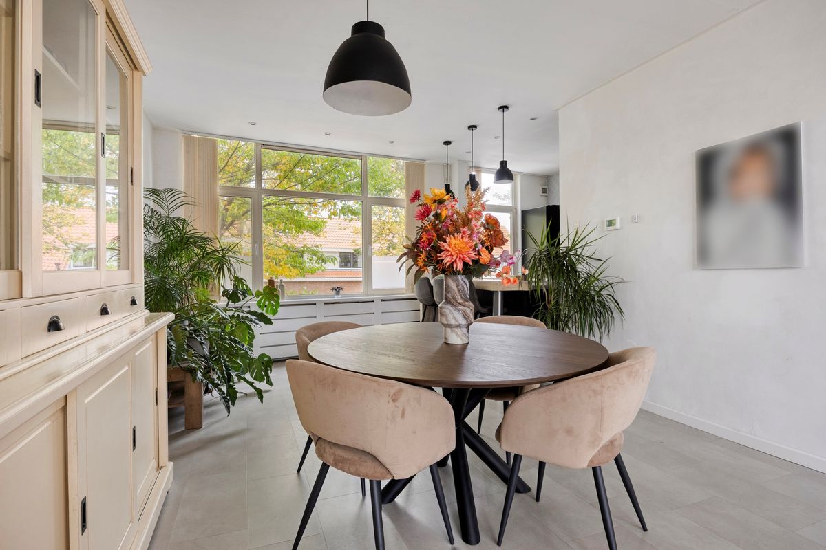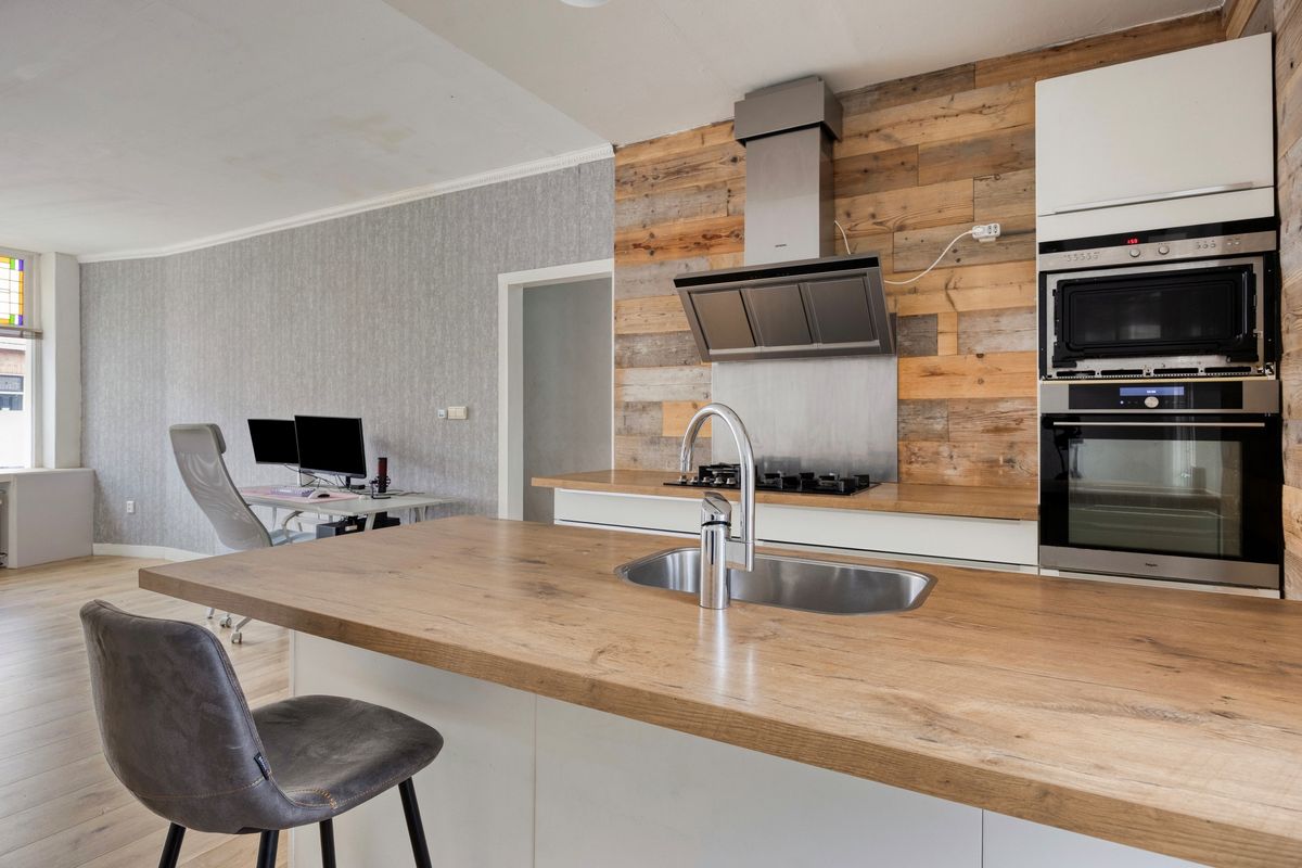 De (woon)kamer is zeer royaal, heeft aan de voorzijde een erker met glas in lood (boven)ramen en een moderne open keuken met ontbijtbar en inbouwapparatuur.