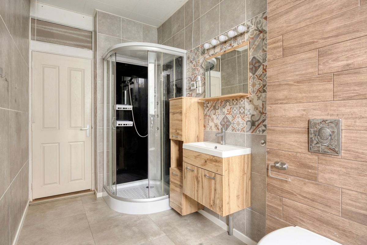 De badkamer is voorzien van een douche, wastafelmeubel, toilet en wasmachine aansluiting.