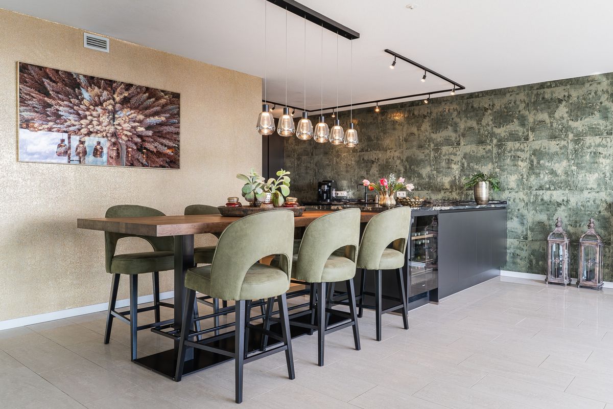 De moderne hoekkeuken (2023) staat in open verbinding met de woonkamer en is compleet uitgerust met o.a. Bora inductiekookplaat met geïntegreerde afzuigkap, 2 maal combi oven/magnetron, vaatwasser, Quooker heetwaterkraan, koelkast en wijnkast. Direct naast de keuken ligt de praktische bijkeuken met aansluiting voor wasapparatuur en extra bergruimte.