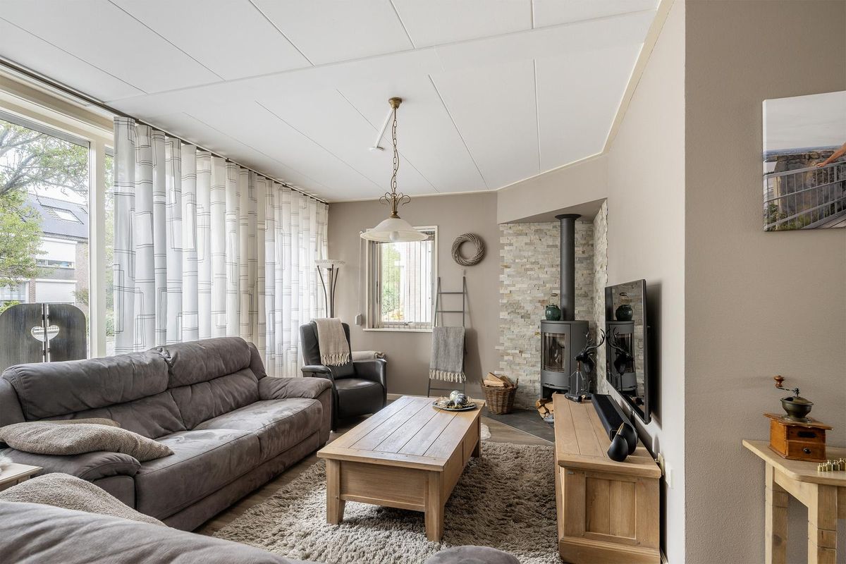Riante L-vormige woonkamer met een sfeervolle houtkachel, rolluiken rondom en een schuifpui aan de achterzijde.