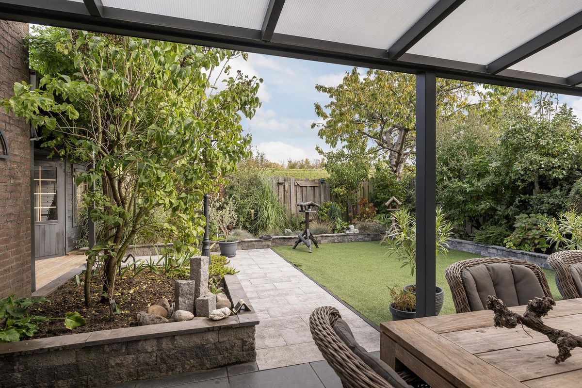 De achtertuin is gelegen op het zuidoosten en heeft sierbestrating, plantenborders, kunstgras, 2 gezellige overkappingen elektra en een buitenkraan.