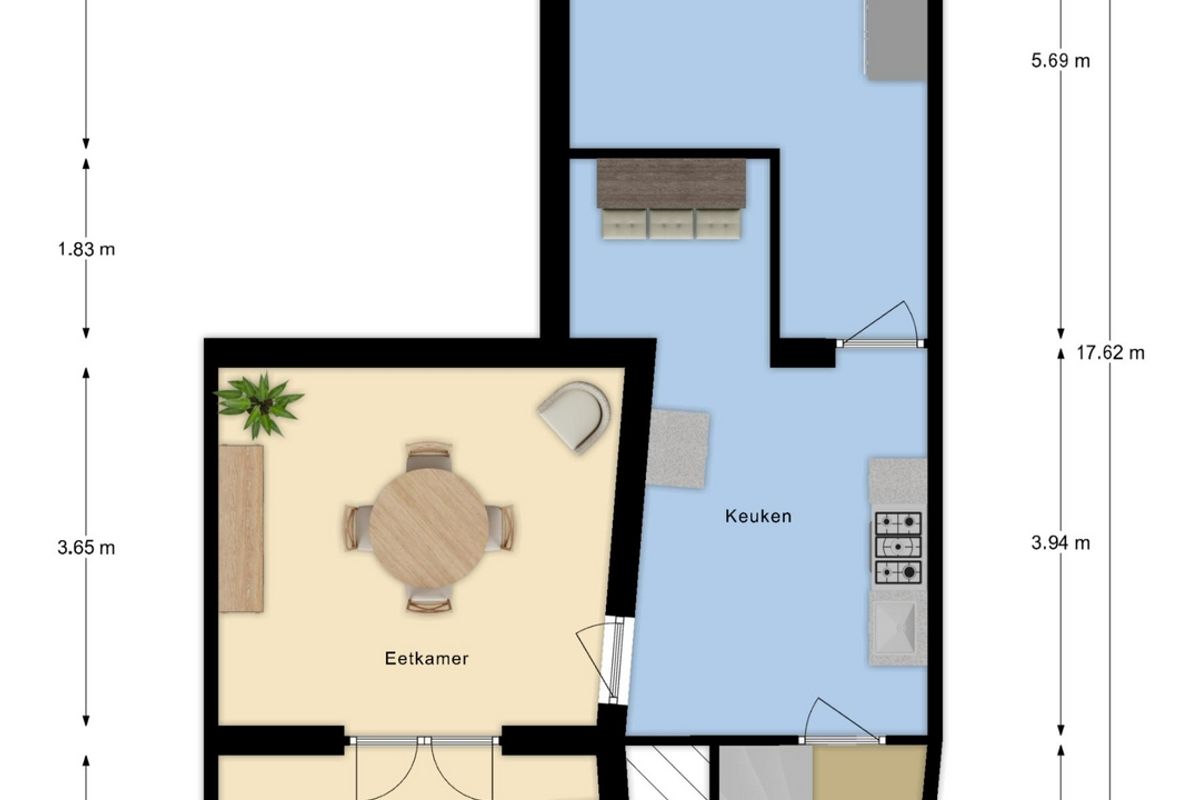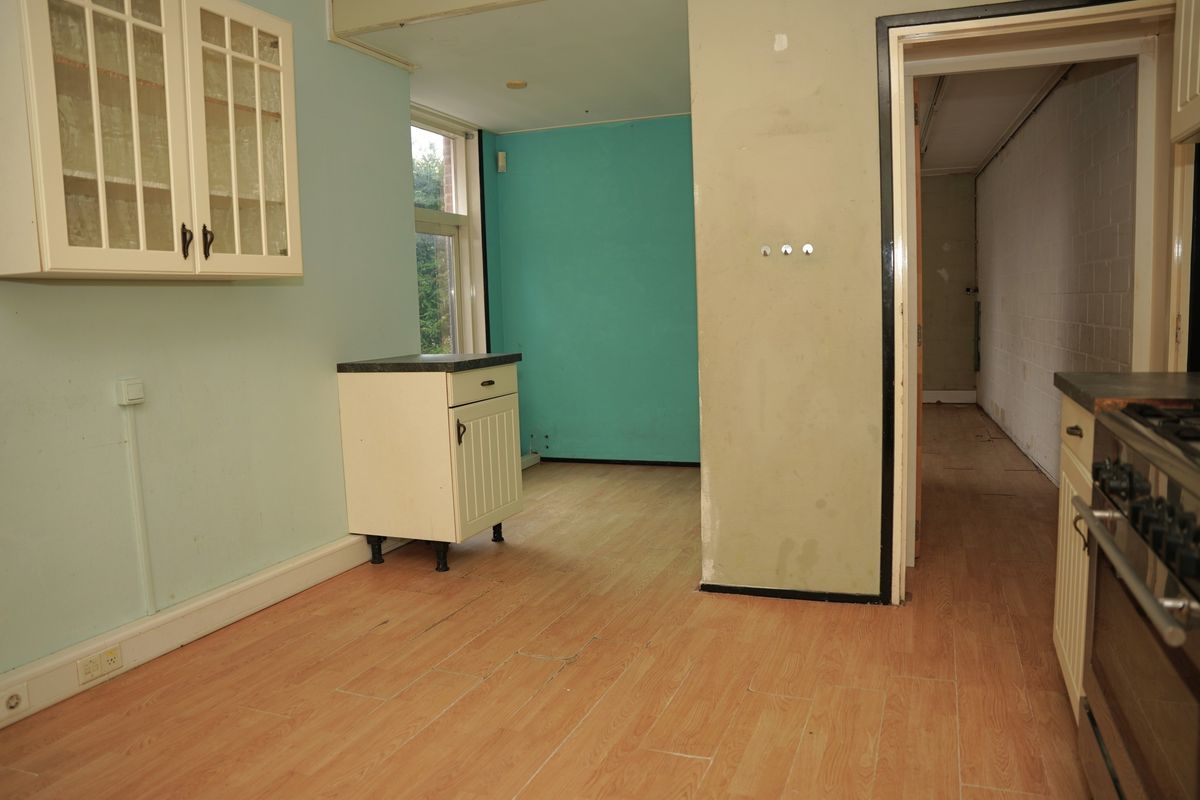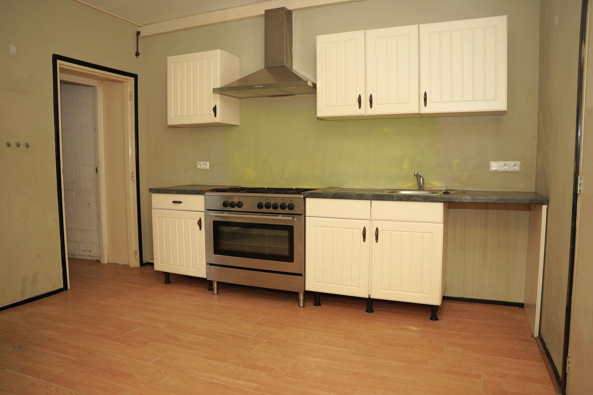 De keuken is uitgerust met een fornuis, oven en afzuigkap en biedt ruimte voor een moderne make-over. Er is een speelse extra ruimte in de keuken, voor bijvoorbeeld een gezellige bartafel.