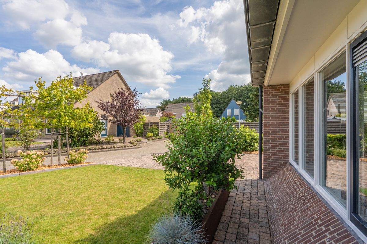 De verzorgde tuin biedt veel privacy en beschikt over een ruim buitenverblijf met houtkachel en elektra. Dit buitenverblijf is afsluitbaar met verandazeil, waardoor je er het hele jaar door van kunt genieten. Aan de rechterzijde van de tuin een afdak voor houtopslag.